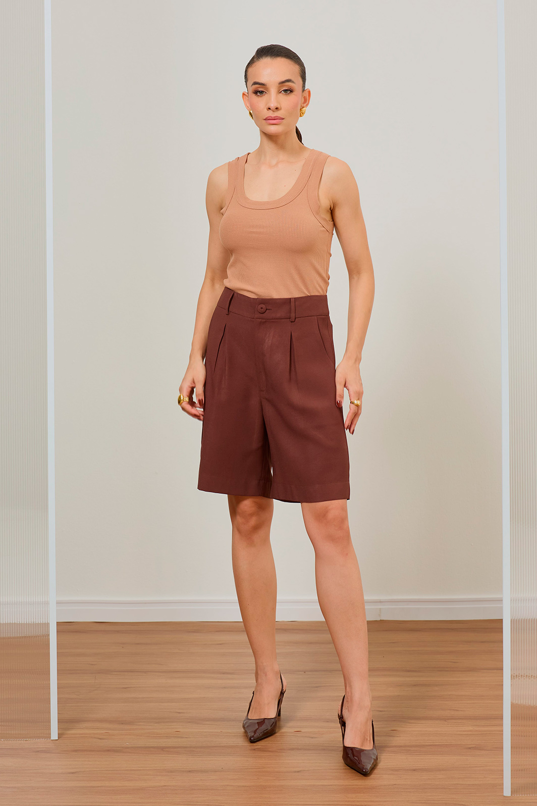 Combine com regatas caneladas em tons terrosos para um visual monocromático moderno. Finalize com scarpins ou sandálias de bico fino para elevar a produção.