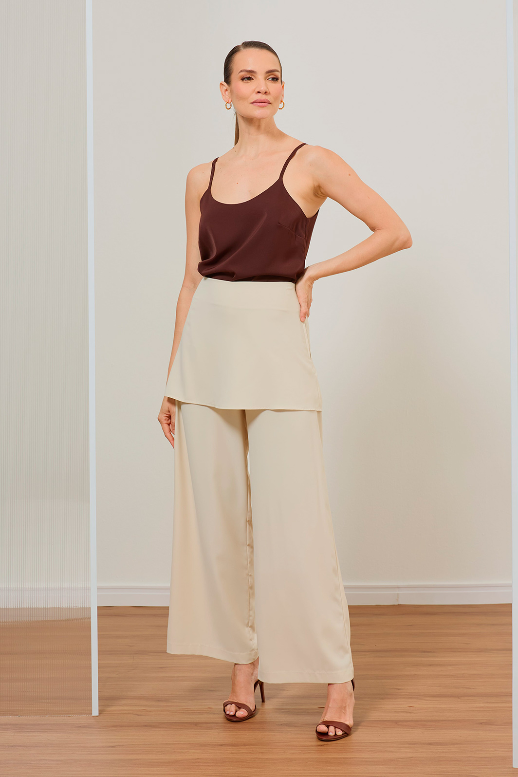 Combine com calças pantalonas em tons neutros para um visual monocromático e alongado. Para uma proposta casual-chic, aposte em jeans e blazers estruturados. Finalize com sandálias de salto fino e acessórios delicados para manter a estética refinada.