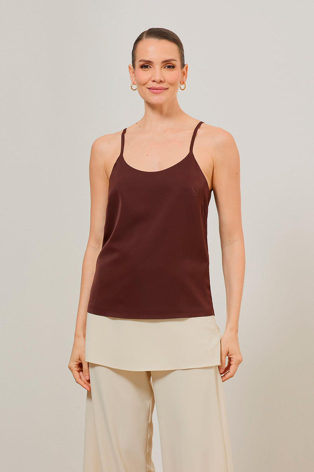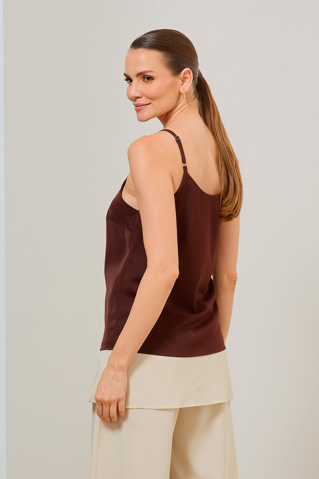 A Blusa Alça Decote Redondo é o sinônimo da elegância minimalista e fluida. Seu design clean e o caimento leve trazem um ar sofisticado e versátil para produções que transitam com facilidade do dia para a noite.