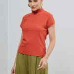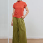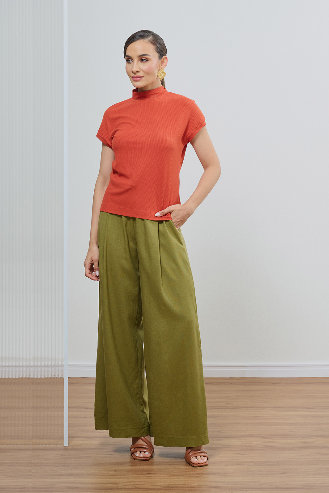 Combine as tonalidades terracota ou verde com partes de baixo em tons terrosos para um visual harmônico. Aposte em pantalonas ou saias midi para elevar a proposta.