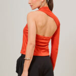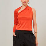 Aposte em calças de alfaiataria em tons neutros para equilibrar a força da cor. Para um visual noturno, finalize com acessórios metalizados e sandálias de salto. Penteados presos são ideais para valorizar a assimetria da peça.