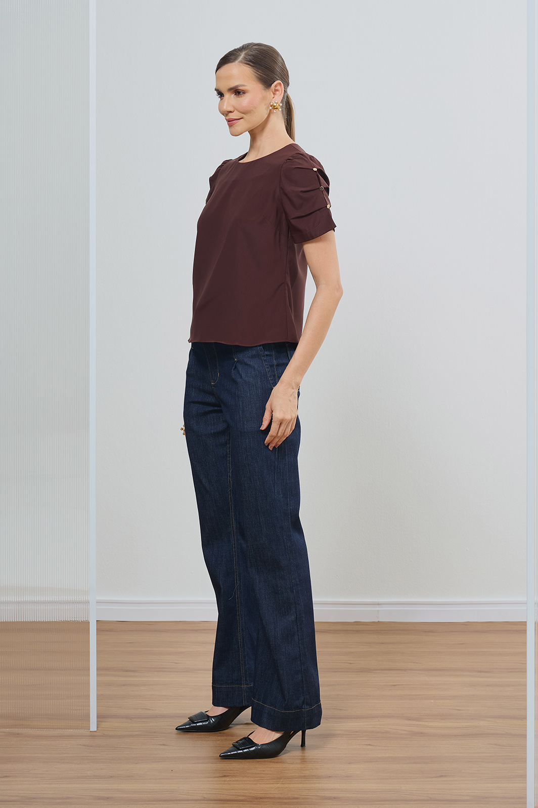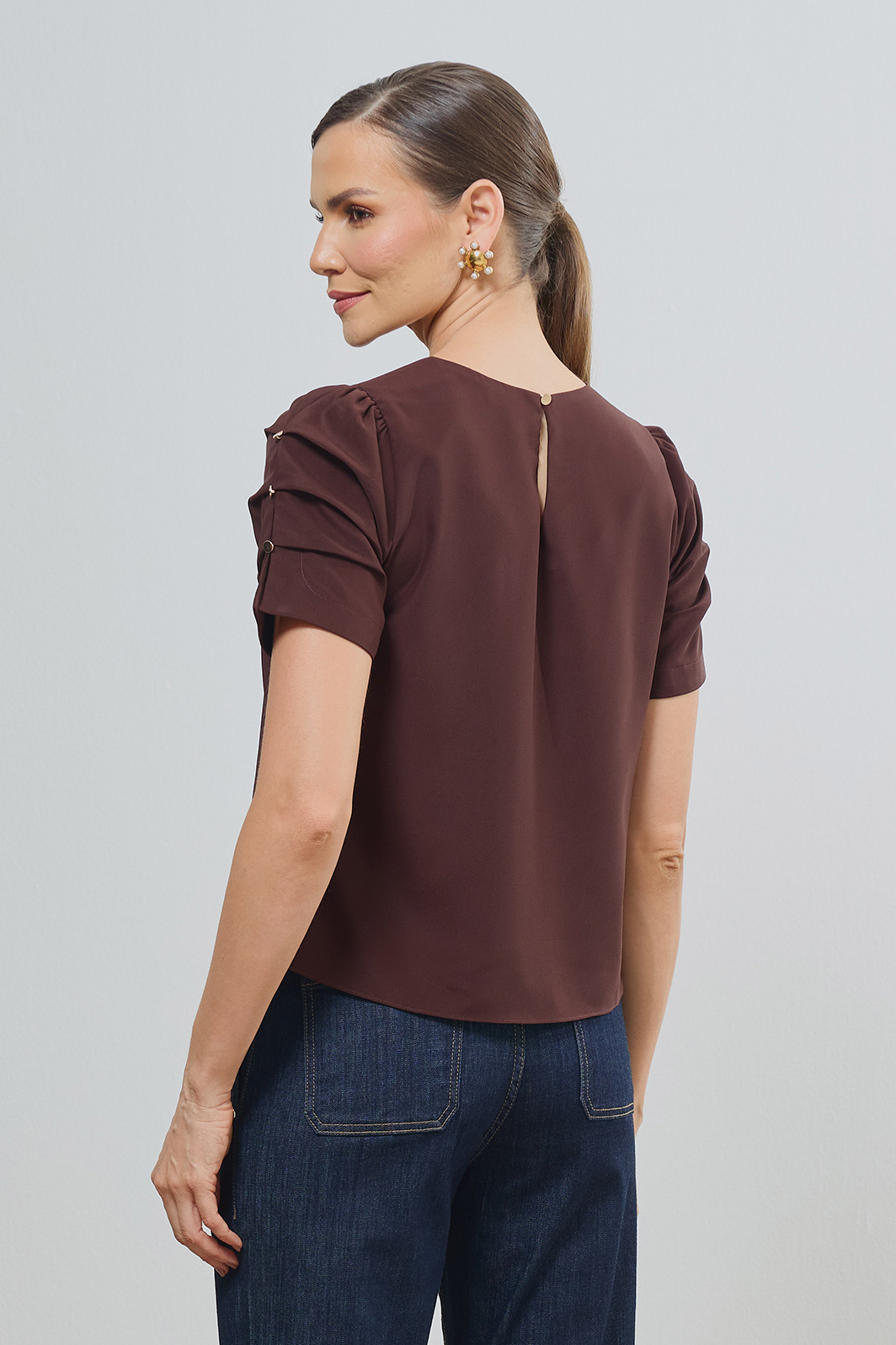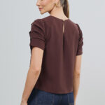Uma peça que traduz a sofisticação TOLI através de detalhes minuciosos. Esta blusa em crepe combina o tom intenso da estação com o charme das mangas trabalhadas, elevando o design essencial a um novo patamar de elegância para o dia a dia.