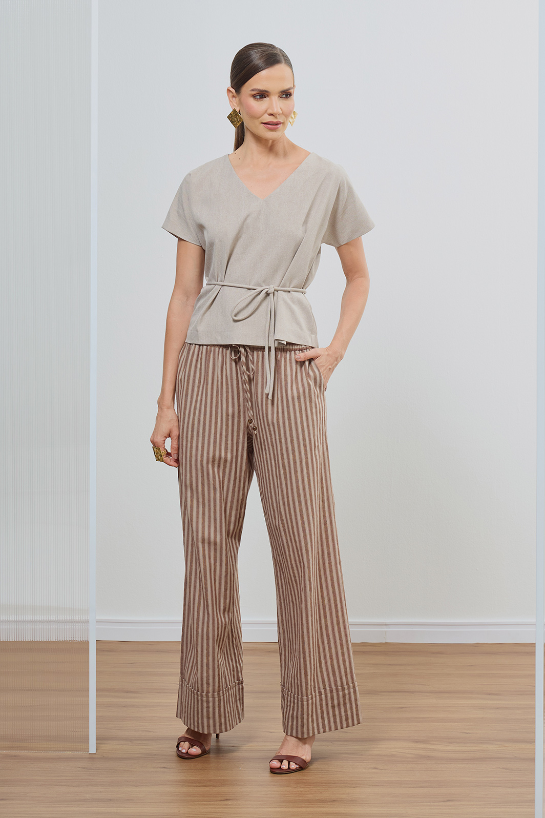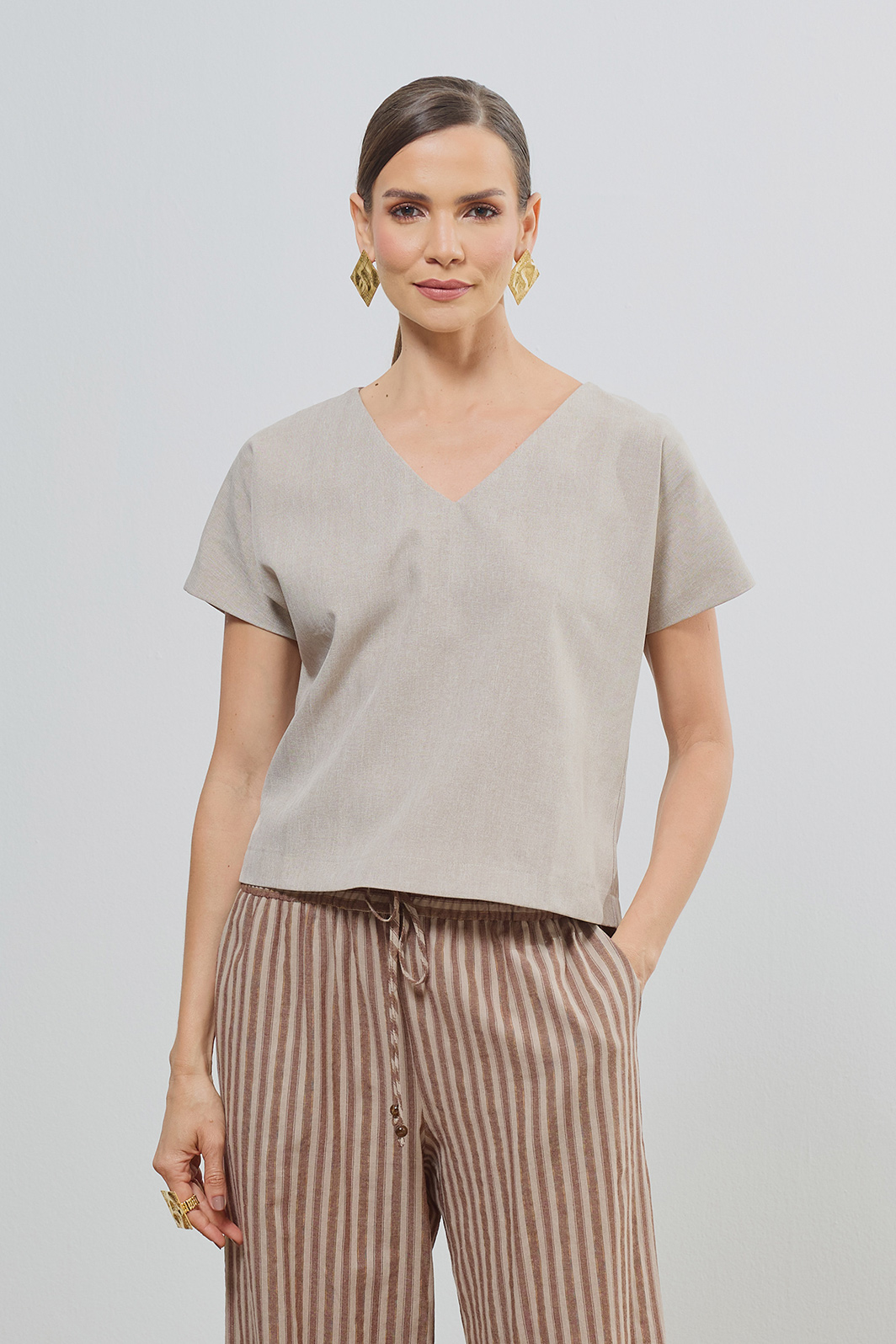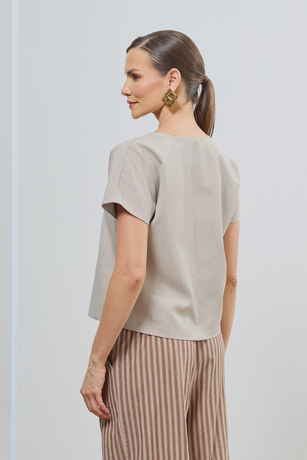 Combine com a calça pantalona listrada da coleção para um visual harmônico e cheio de textura. Para uma proposta mais urbana, use com jeans de lavagem escura e finalize com acessórios dourados e sandálias de tiras finas.