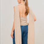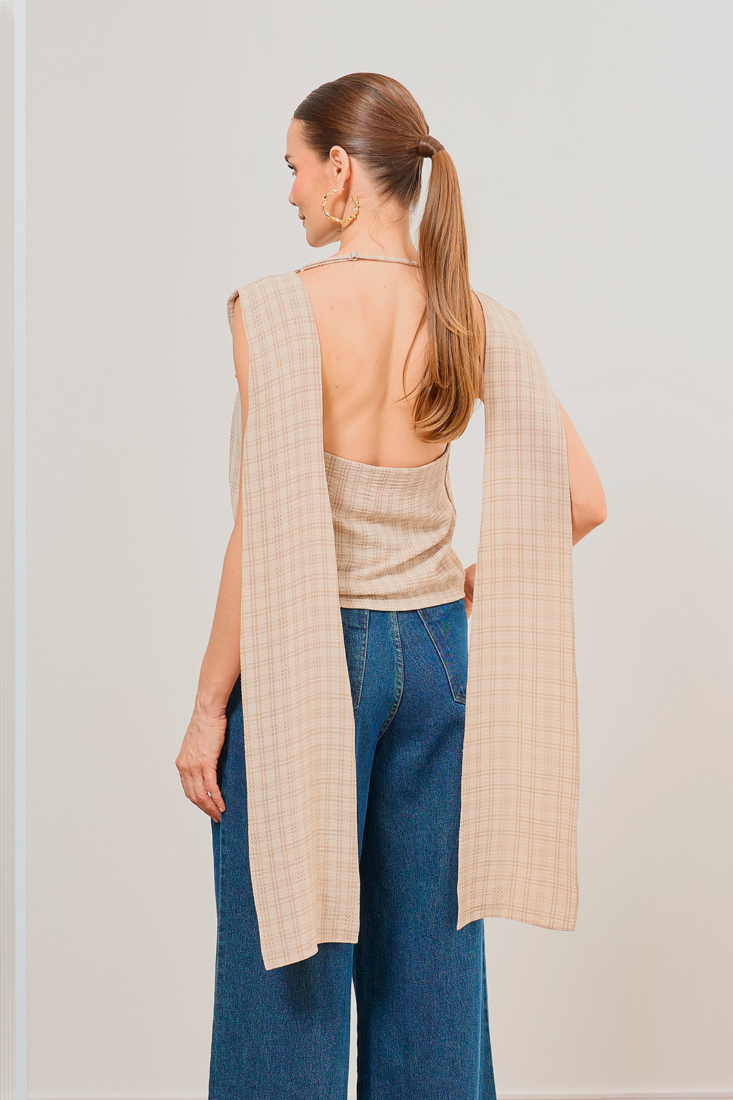 Combine com denim de cintura alta para um equilíbrio entre o casual e o sofisticado. Para ocasiões formais, aposte em pantalonas de alfaiataria. Penteados presos são ideais para valorizar o design das costas e o movimento das faixas.