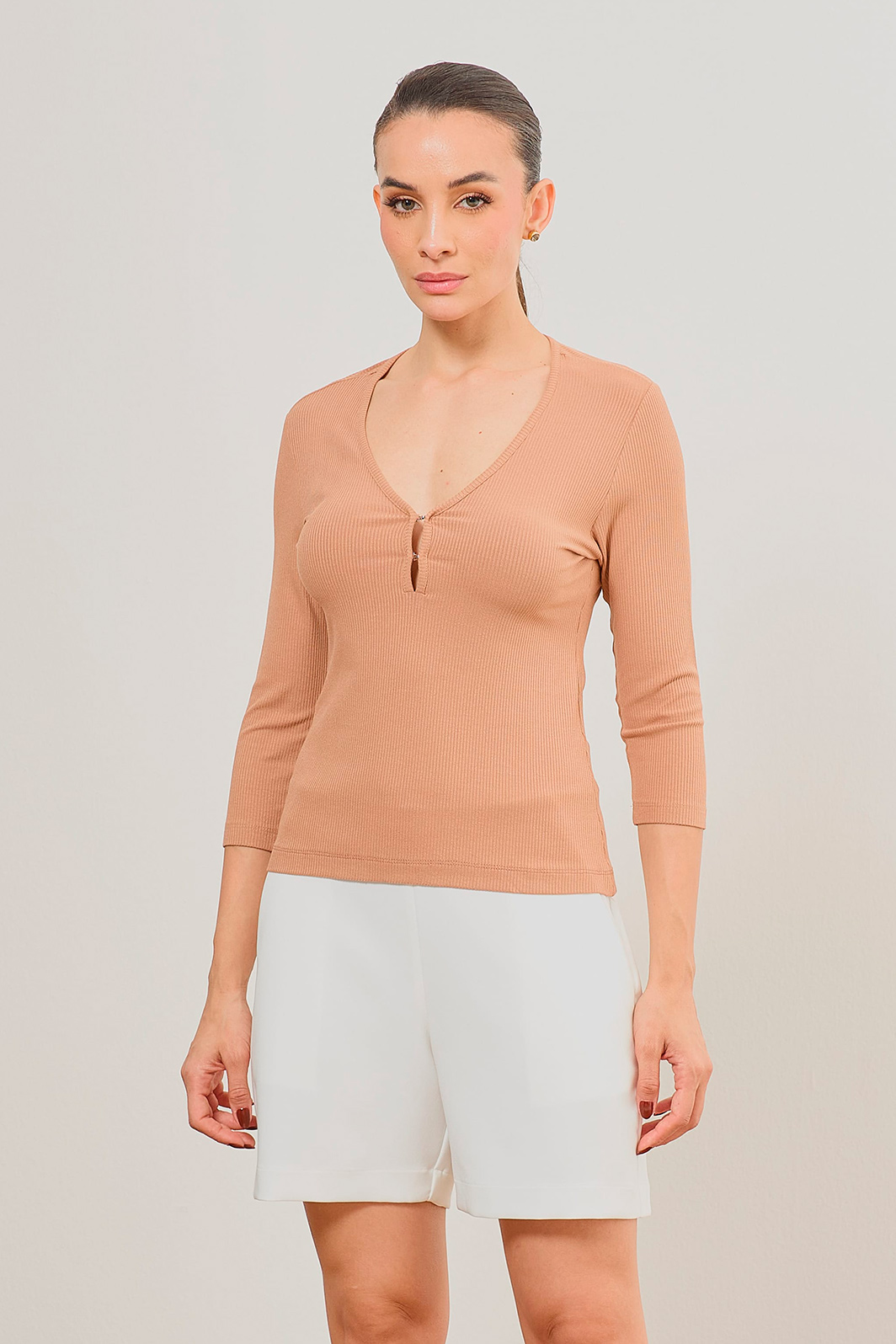 Blusa Manga 3/4 Decote V com Fecho Canelada