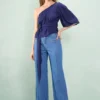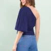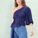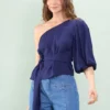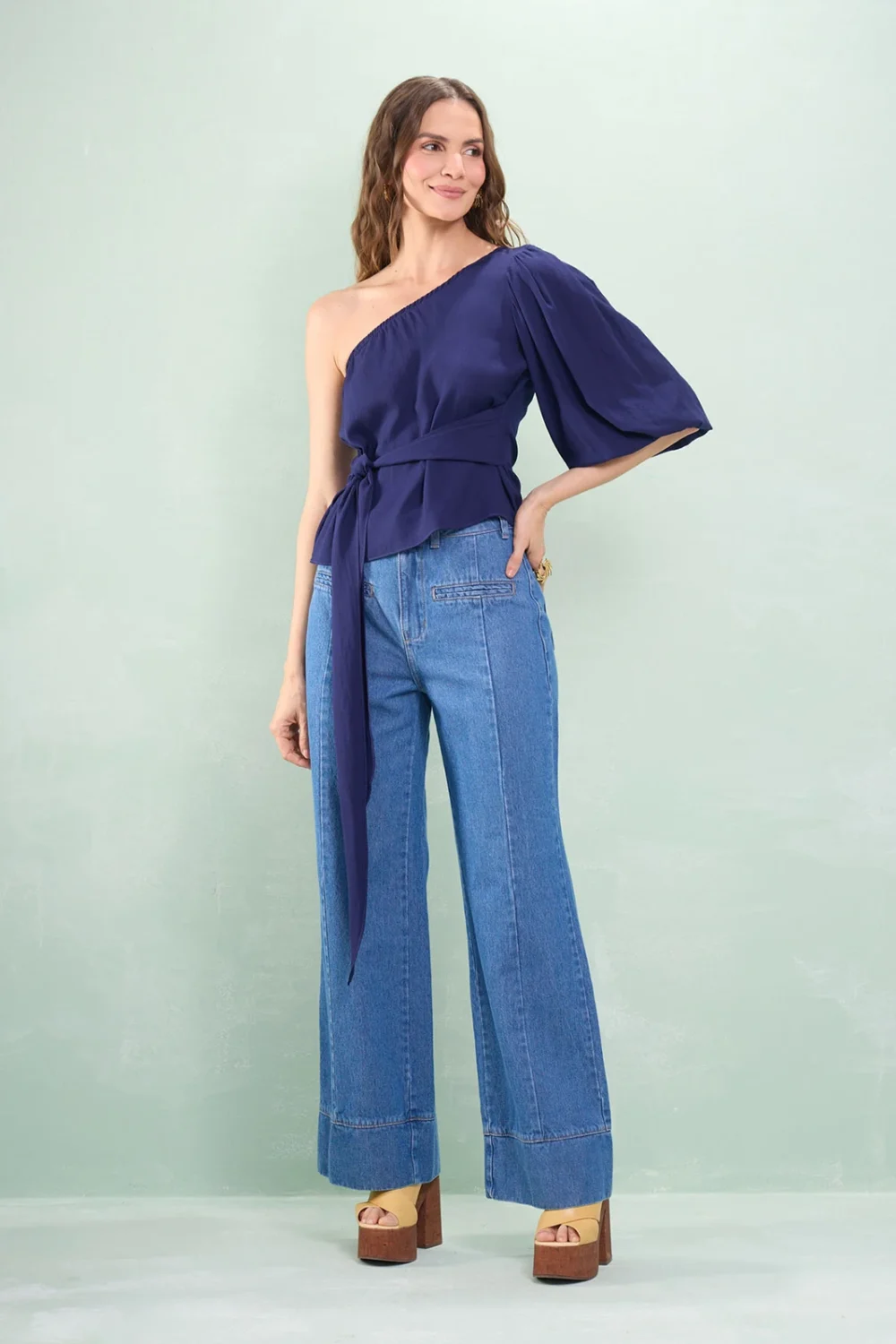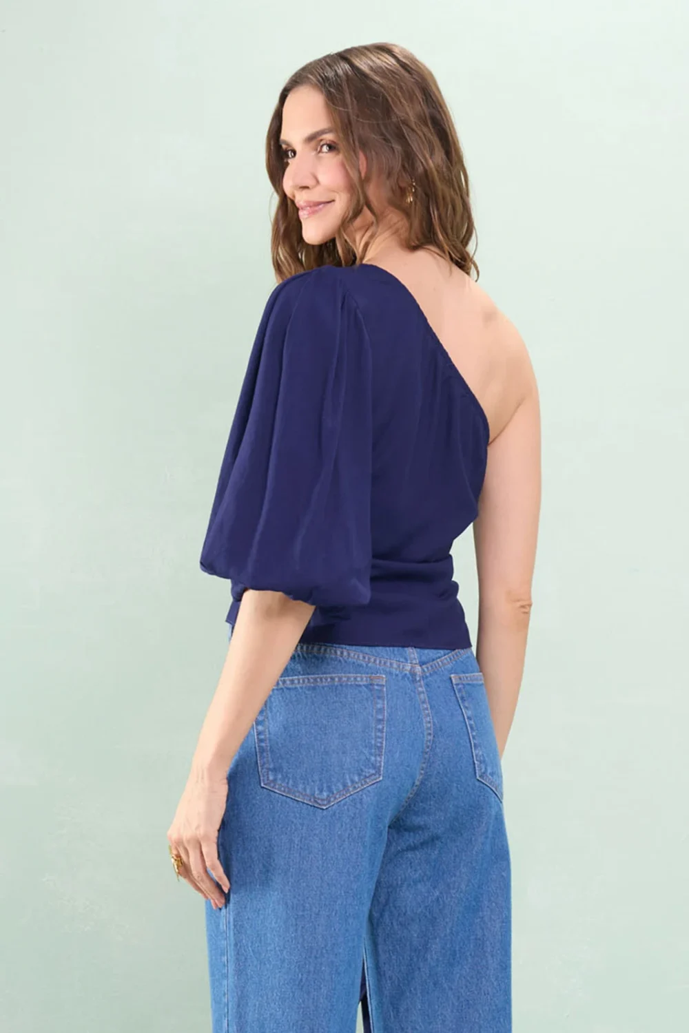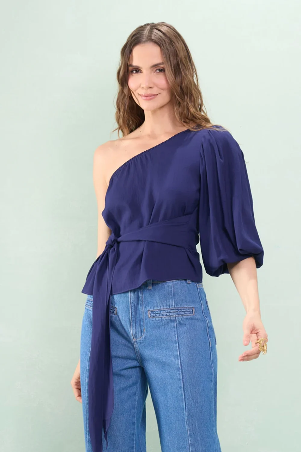 Blusa Ombro Único Com Manga Balonê e Faixa Viscocrepe