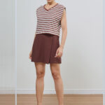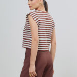 Blusa feminina semi cropped confeccionada em moletinho listrado nas cores marrom e off-white, apresentando shape com ombros estruturados e decote em V. O design moderno une o conforto do toque macio a uma estética urbana sofisticada, sendo uma peça-chave para produções versáteis e atemporais.
