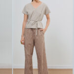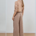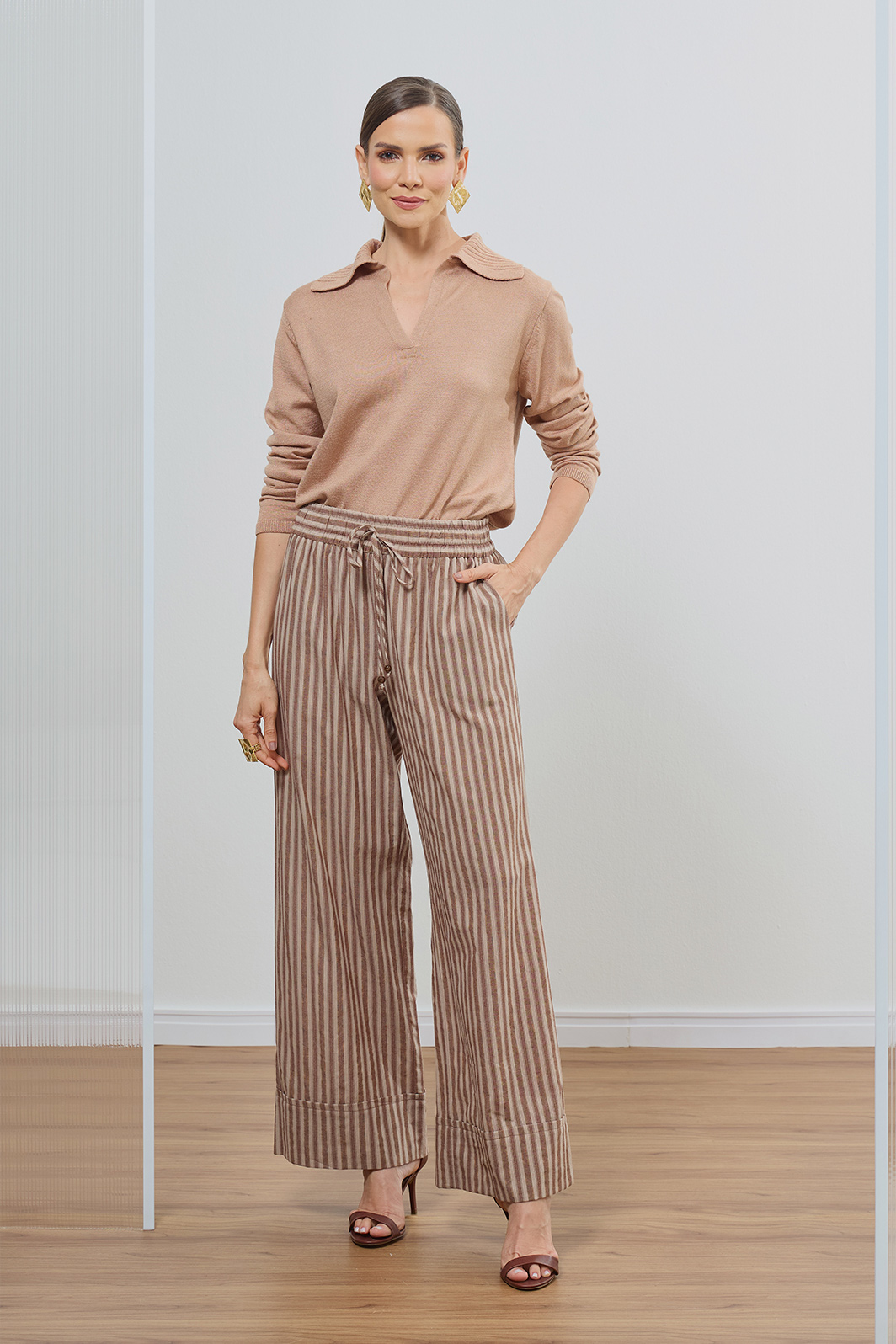 Calça feminina confeccionada em algodão com padronagem listrada em tons de marrom e bege. Apresenta shape pantalona com cós de elástico e cordão para amarração, unindo o máximo conforto a uma estética sofisticada. A barra larga estruturada adiciona um detalhe refinado ao design, tornando-a uma peça versátil e indispensável para produções leves e atemporais.