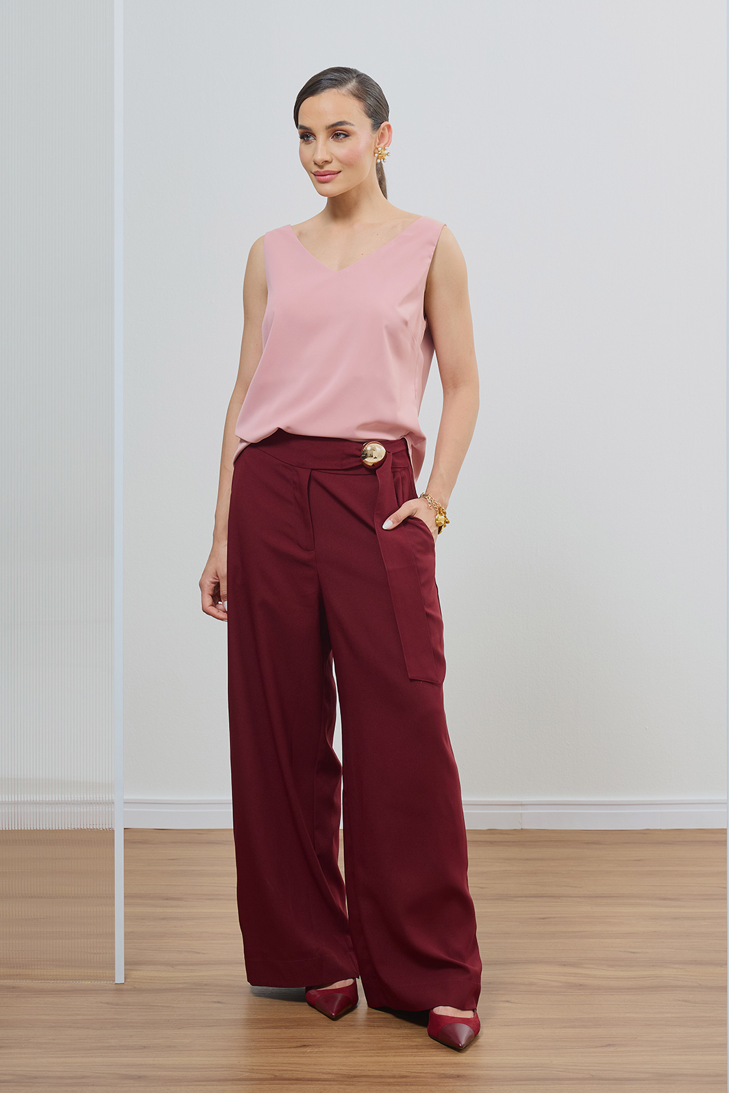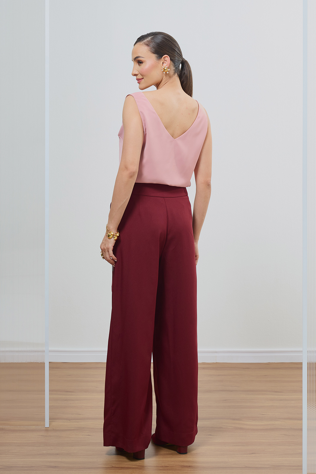 • Modelagem pantalona com caimento fluido e impecável