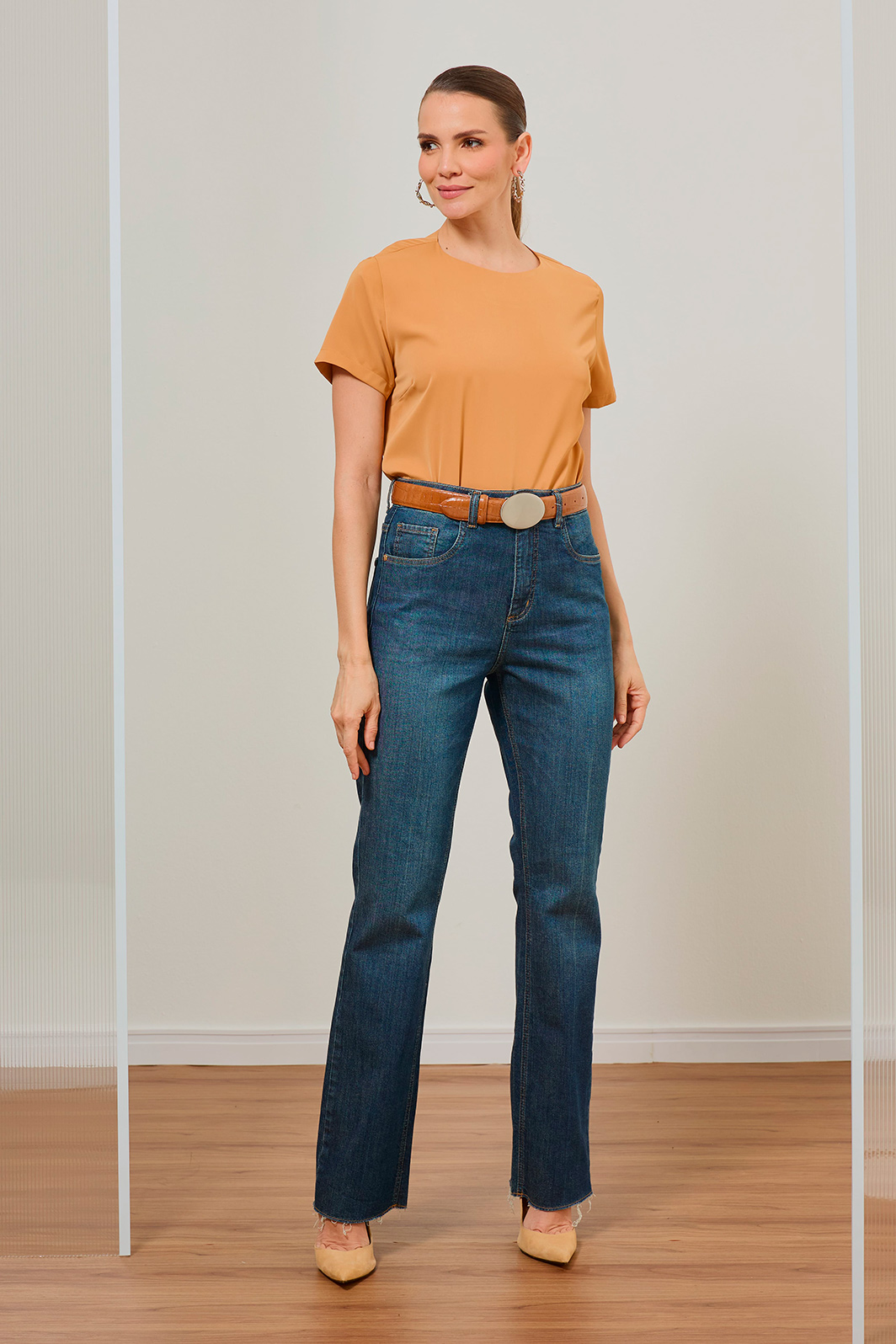 Combine com blusas em tons terrosos e scarpins para um visual office-chic, ou aposte em cintos de fivela orgânica para elevar a proposta casual.