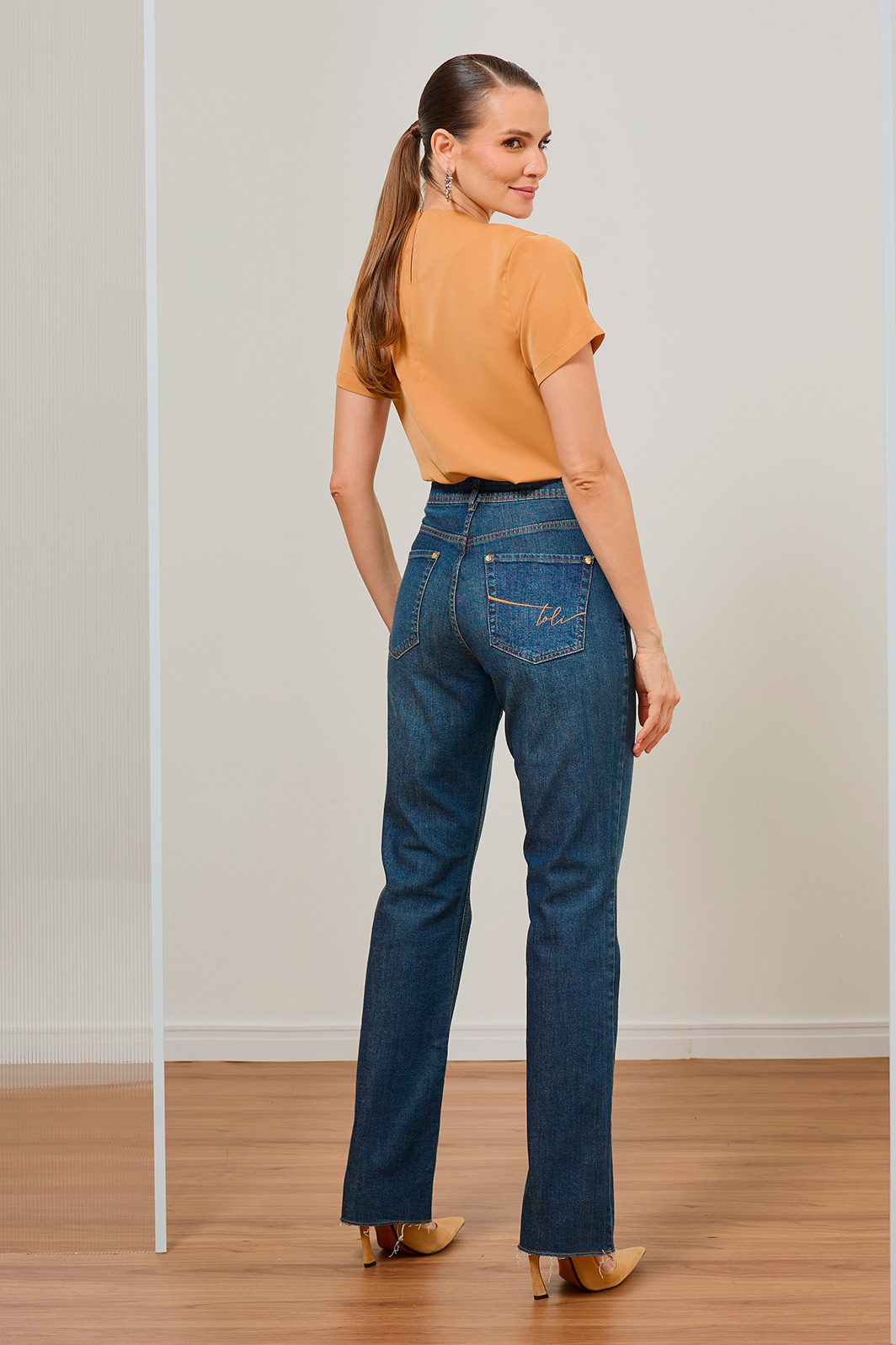 • Bolso posterior com bordado exclusivo TOLI e metais dourados
