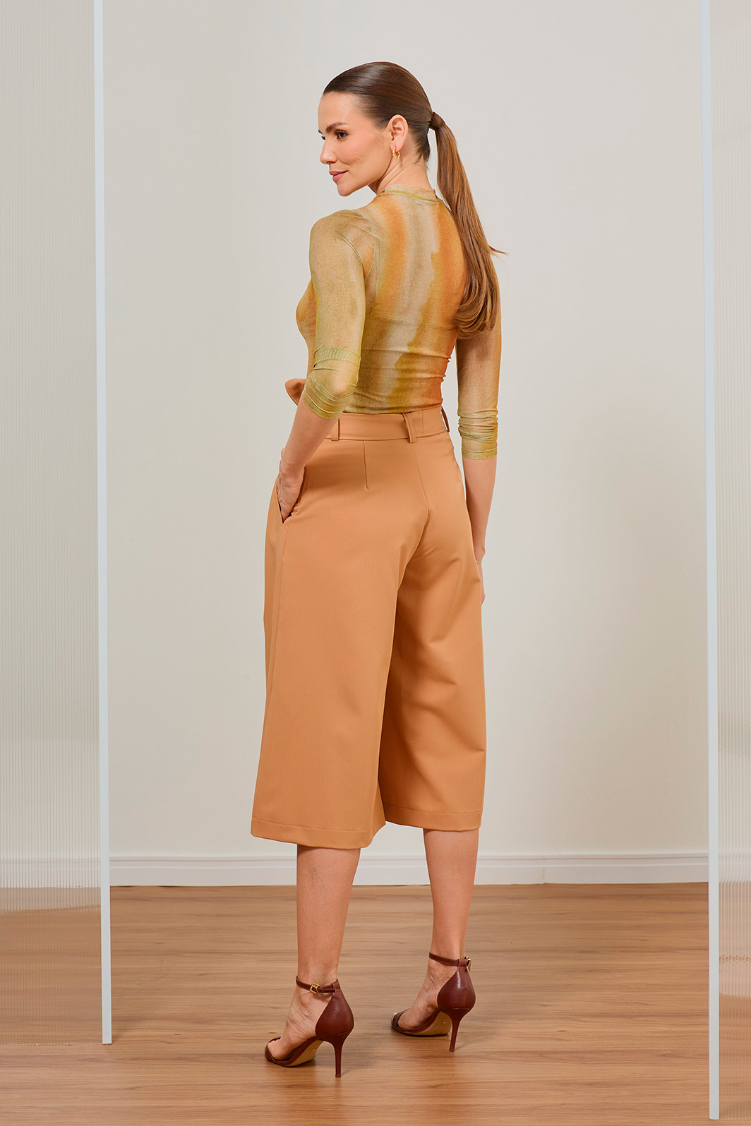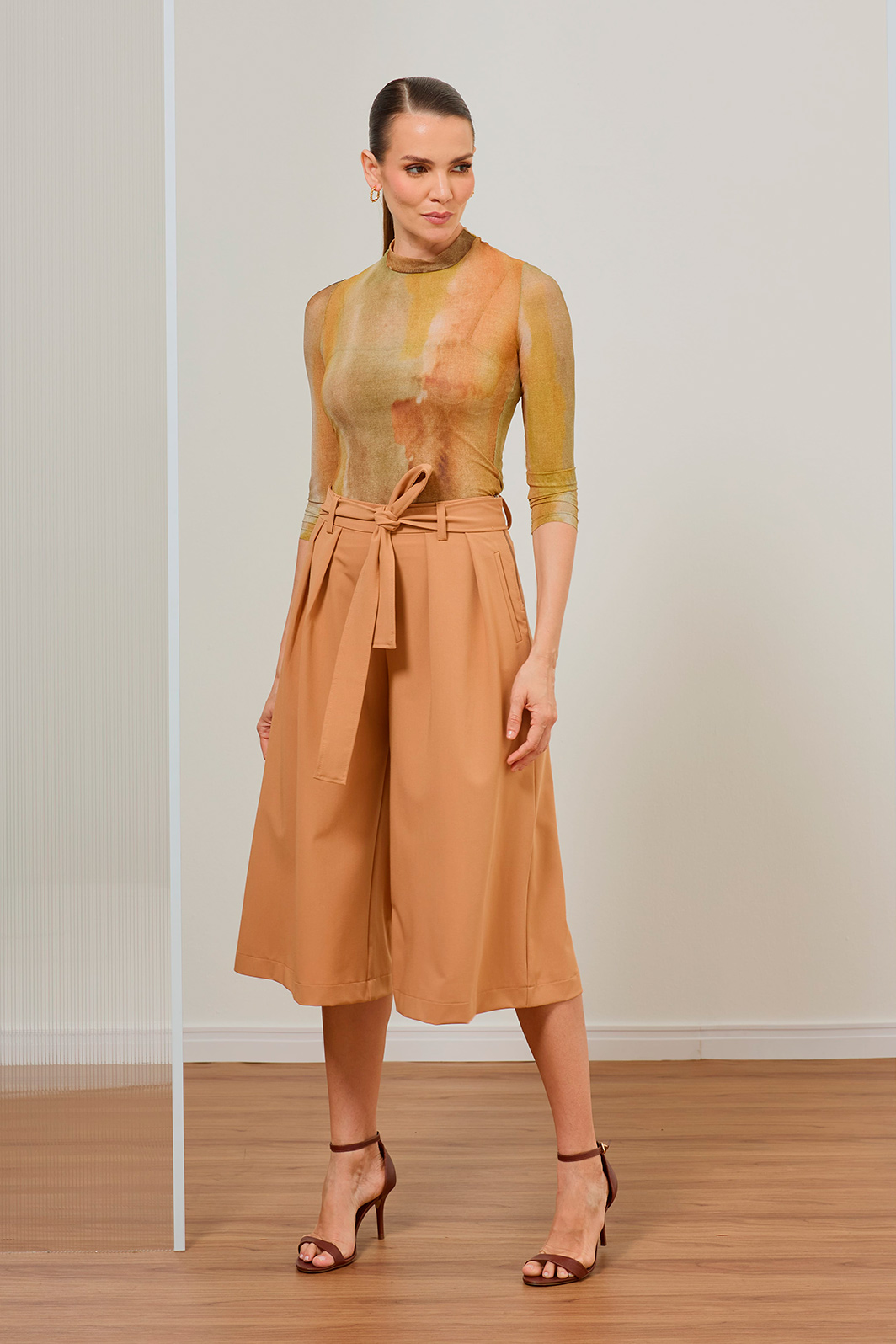 A Calça Pantacourt com Faixa une a sofisticação da alfaiataria ao frescor da modelagem ampla. Seu tom terroso e silhueta fluida trazem personalidade e elegância imediata para produções que transitam com facilidade entre diferentes ocasiões.