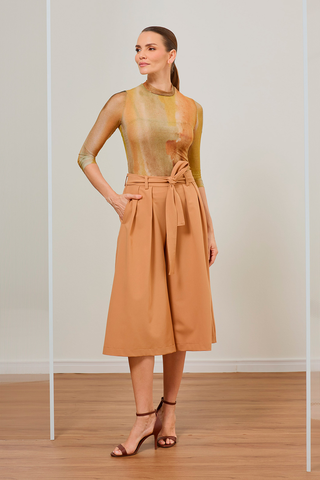 • Modelagem pantacourt com pernas amplas e comprimento midi