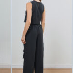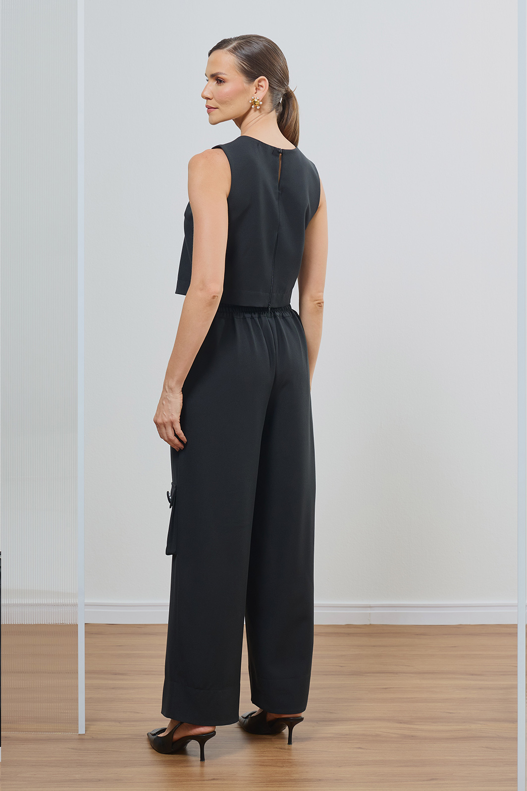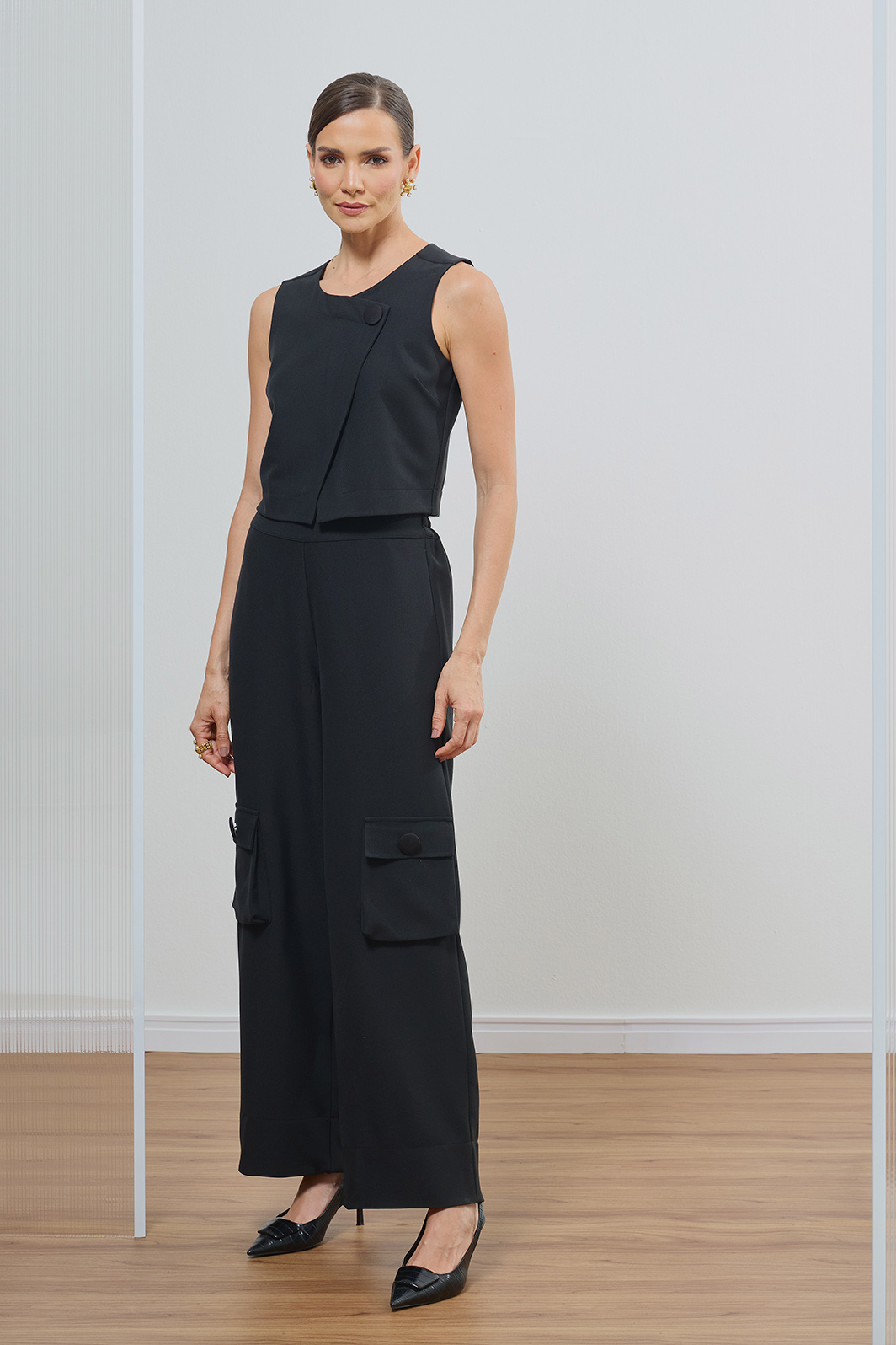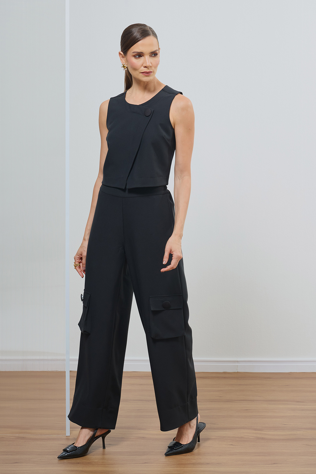 Calça feminina confeccionada em alfaiataria Viscopoli na cor preta, apresentando o shape reto com cintura alta que valoriza a silhueta com elegância. O design se destaca pelos bolsos utilitários laterais com botões forrados, unindo a funcionalidade moderna à sofisticação atemporal do corte.