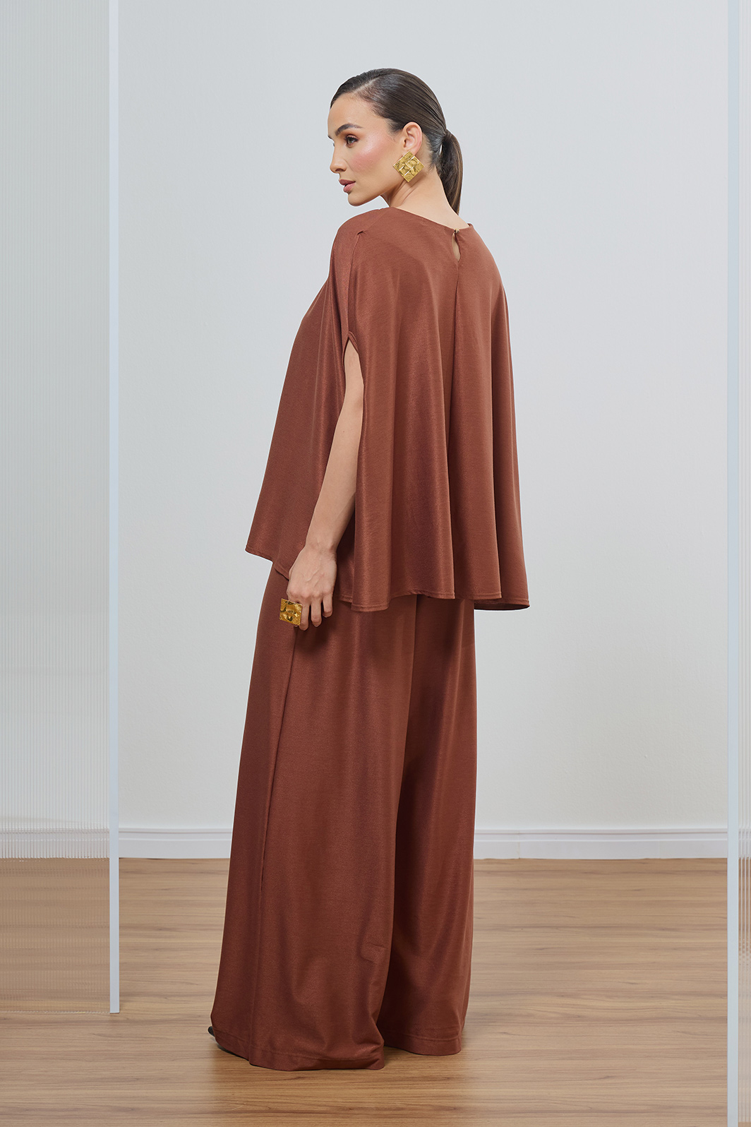 Calça feminina confeccionada em malha jersey de alta qualidade na cor marrom terroso. Apresenta shape reto e cintura com elástico, garantindo um ajuste perfeito que une elegância e conforto absoluto. É uma peça essencial e versátil, ideal para compor conjuntos sofisticados e atemporais com a fluidez característica da marca.