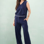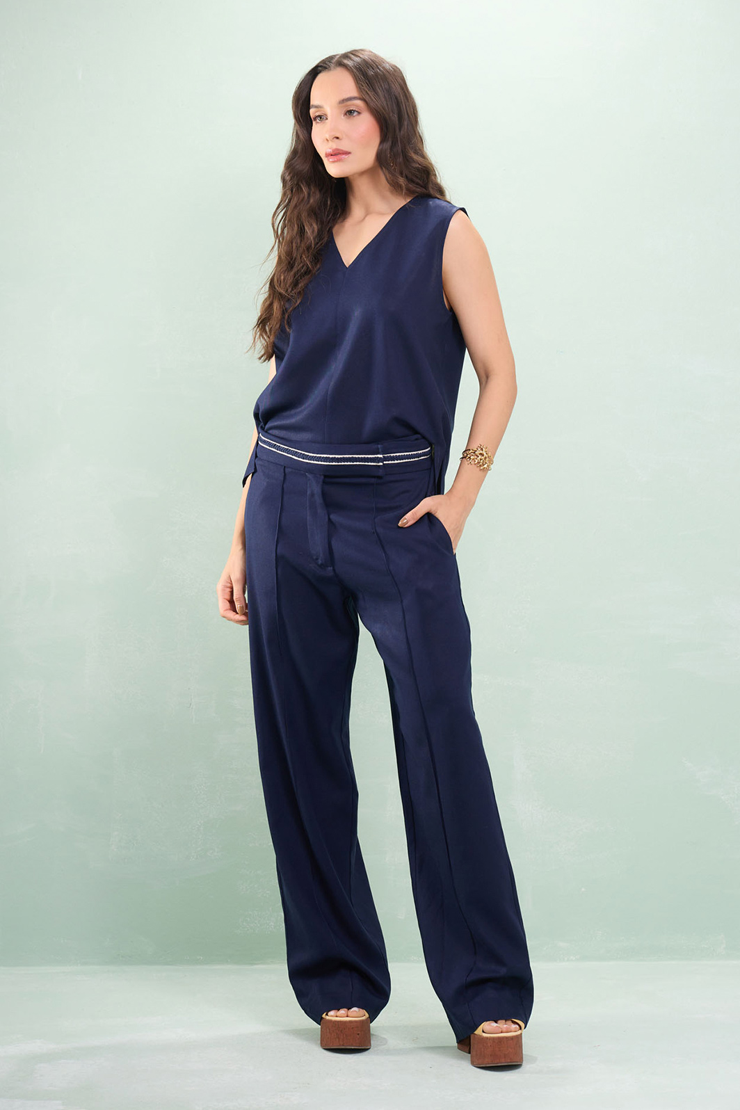Calça Reta Detalhe Corda No Cós Linho