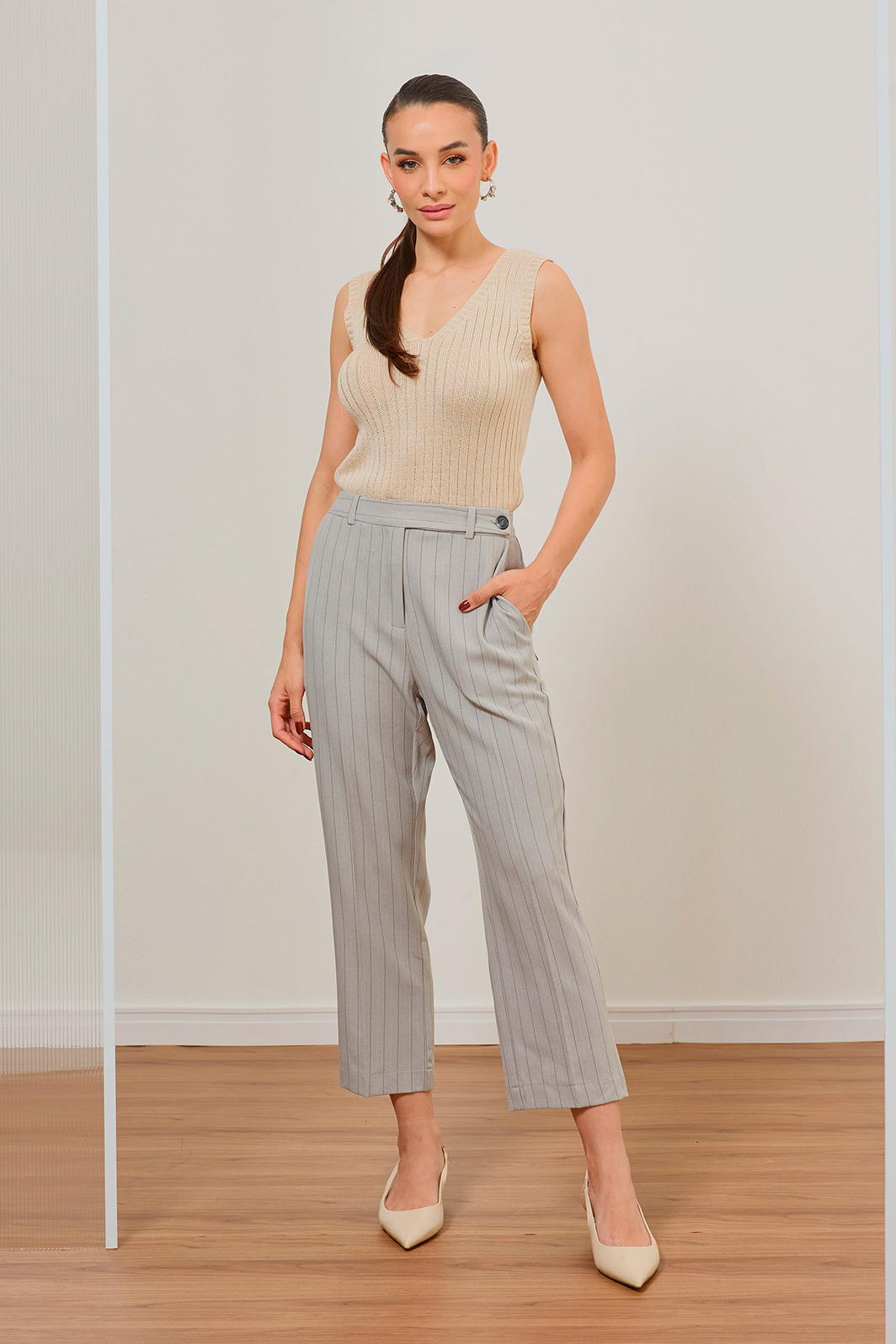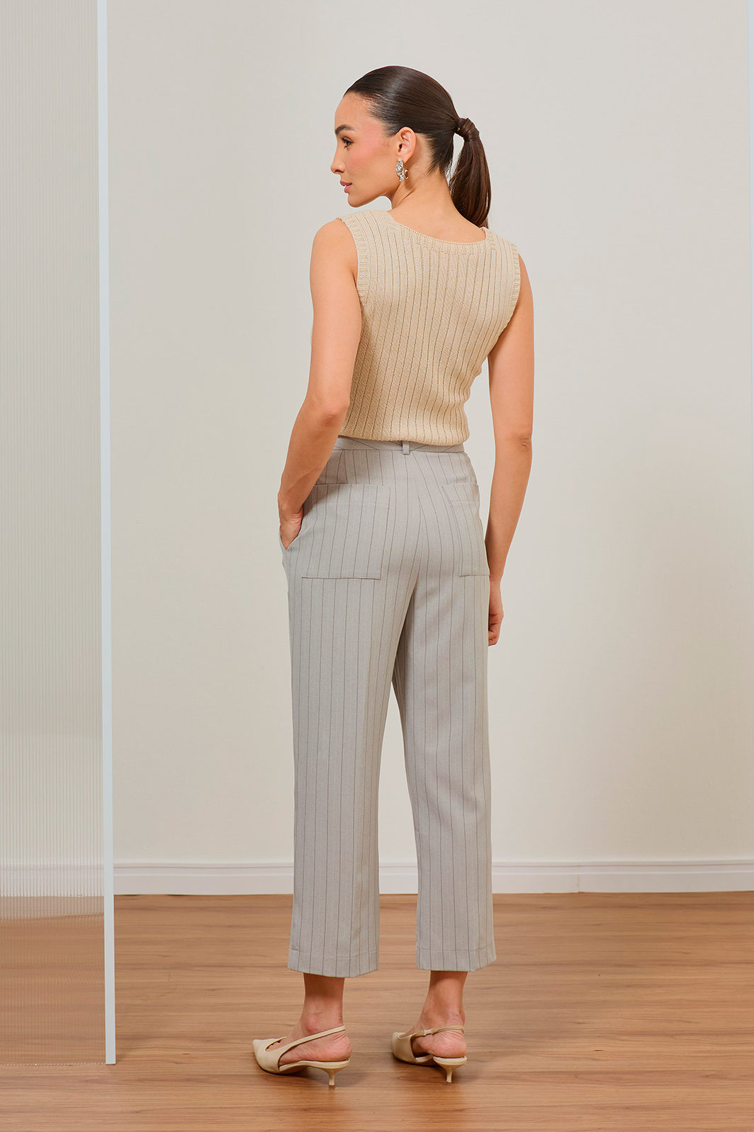 • Padronagem risca de giz clássica em tons neutros para máxima versatilidade