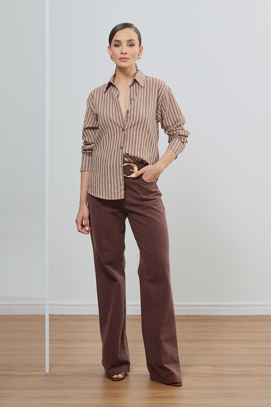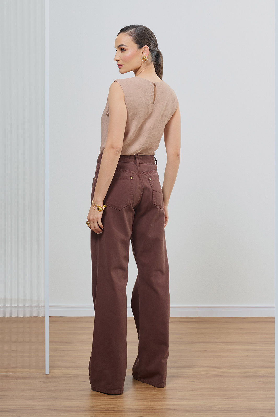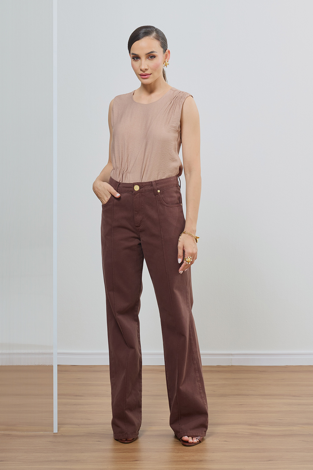 Calça feminina confeccionada em sarja de alta qualidade na cor marrom café. Apresenta o shape wide leg com cintura alta e nervuras frontais pespontadas, que conferem estrutura e alongam a silhueta com sofisticação. É um básico elevado e versátil, ideal para compor produções modernas que transitam com elegância entre o closet casual e o office look.