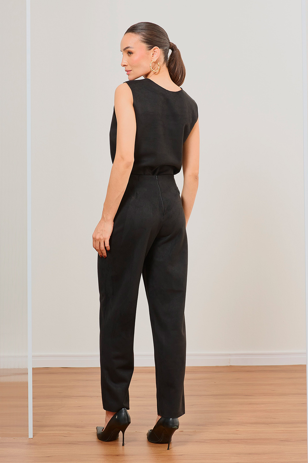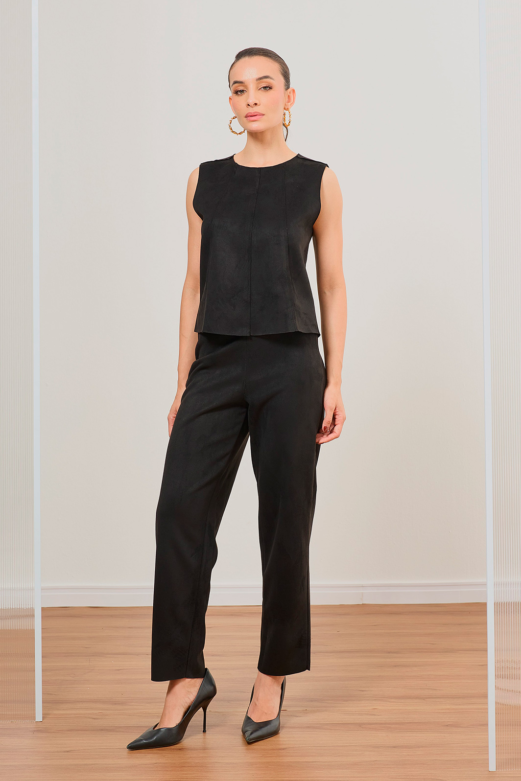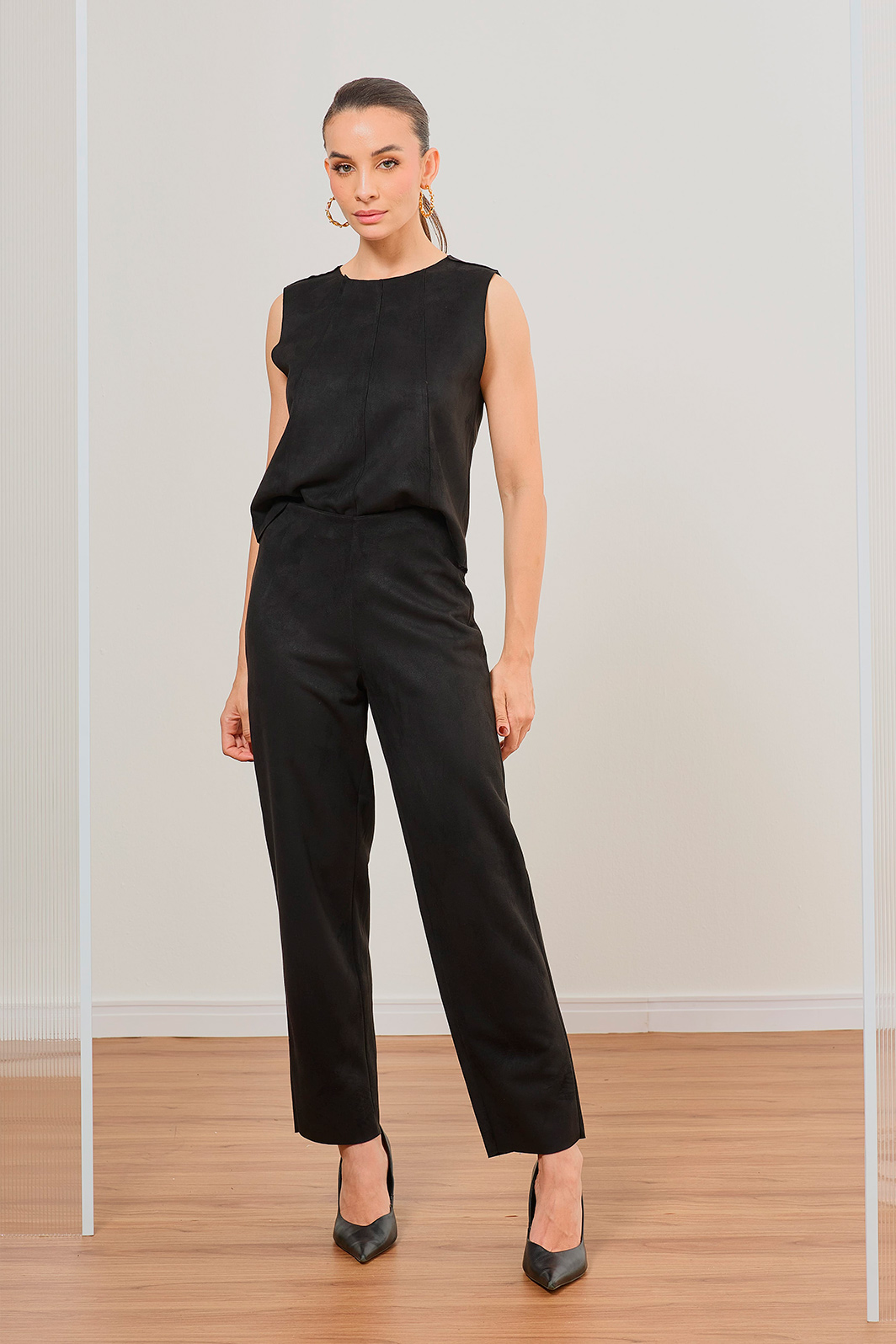 A Calça Slim em suede traz uma proposta elegante e contemporânea, com toque macio e acabamento sofisticado. A modelagem ajustada valoriza a silhueta com naturalidade, enquanto a barra a fio adiciona um detalhe moderno e descomplicado ao visual.