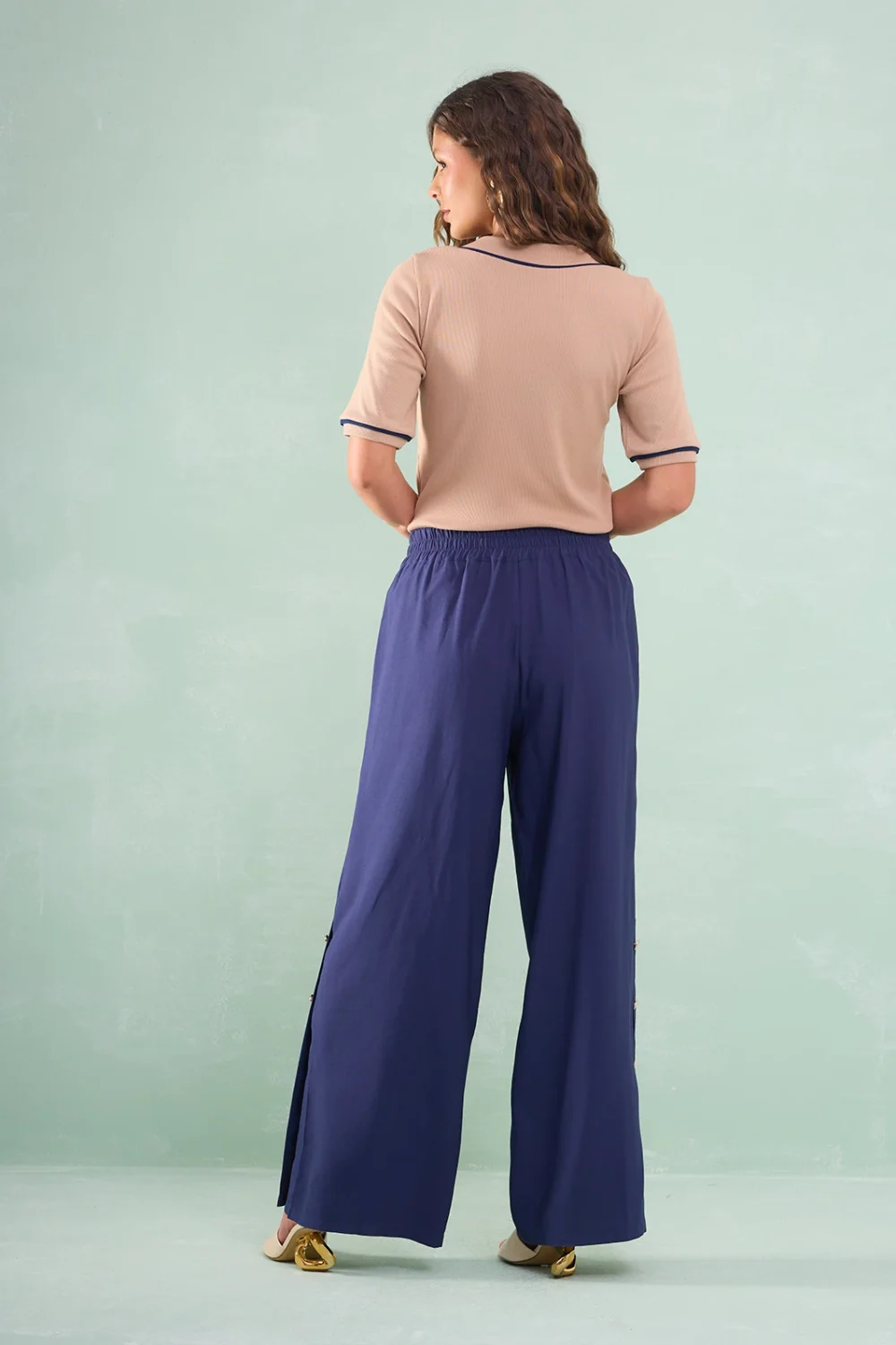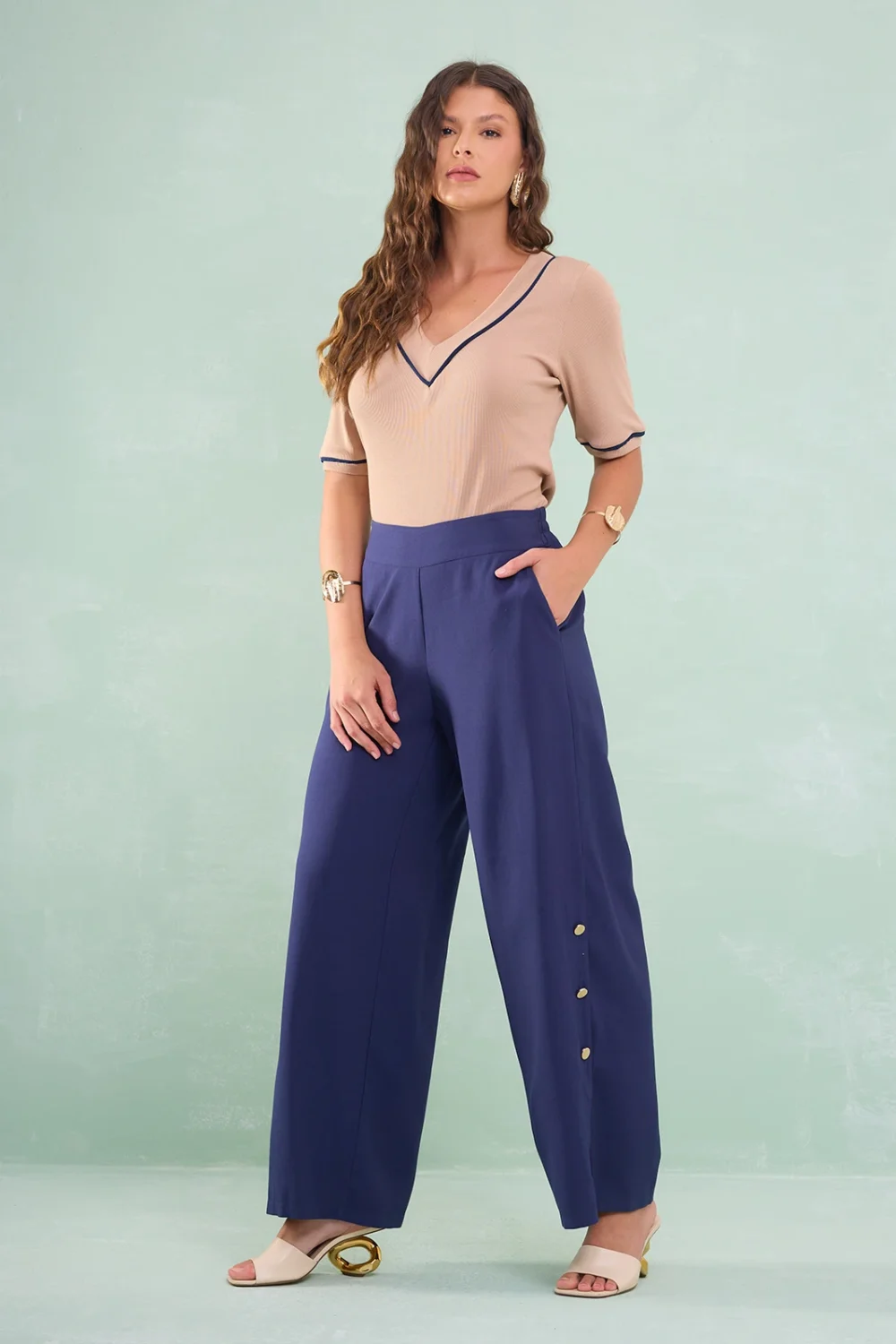 Calça Wide Leg Com Abotoamento Lateral Viscose