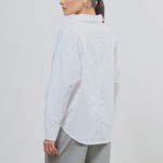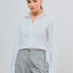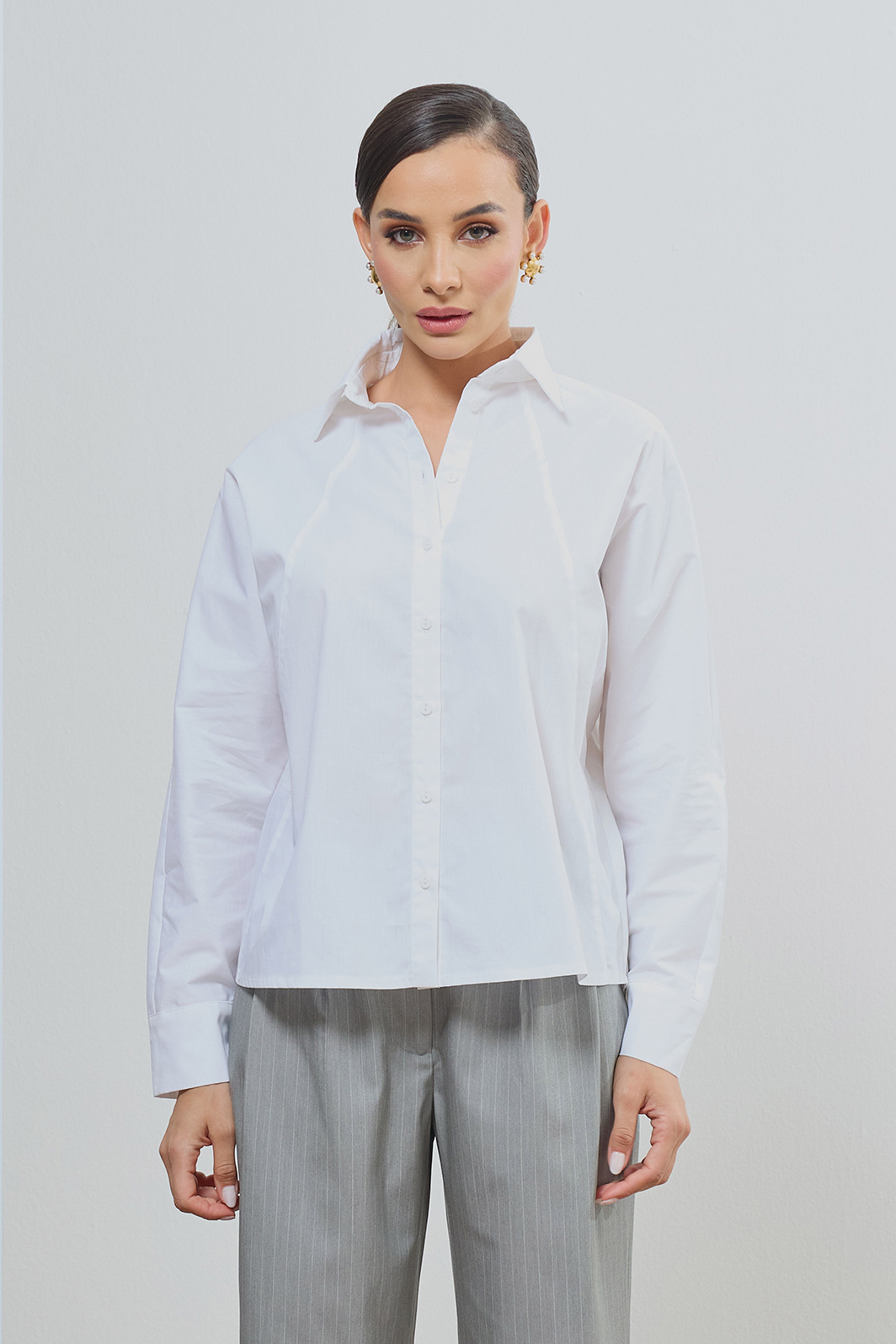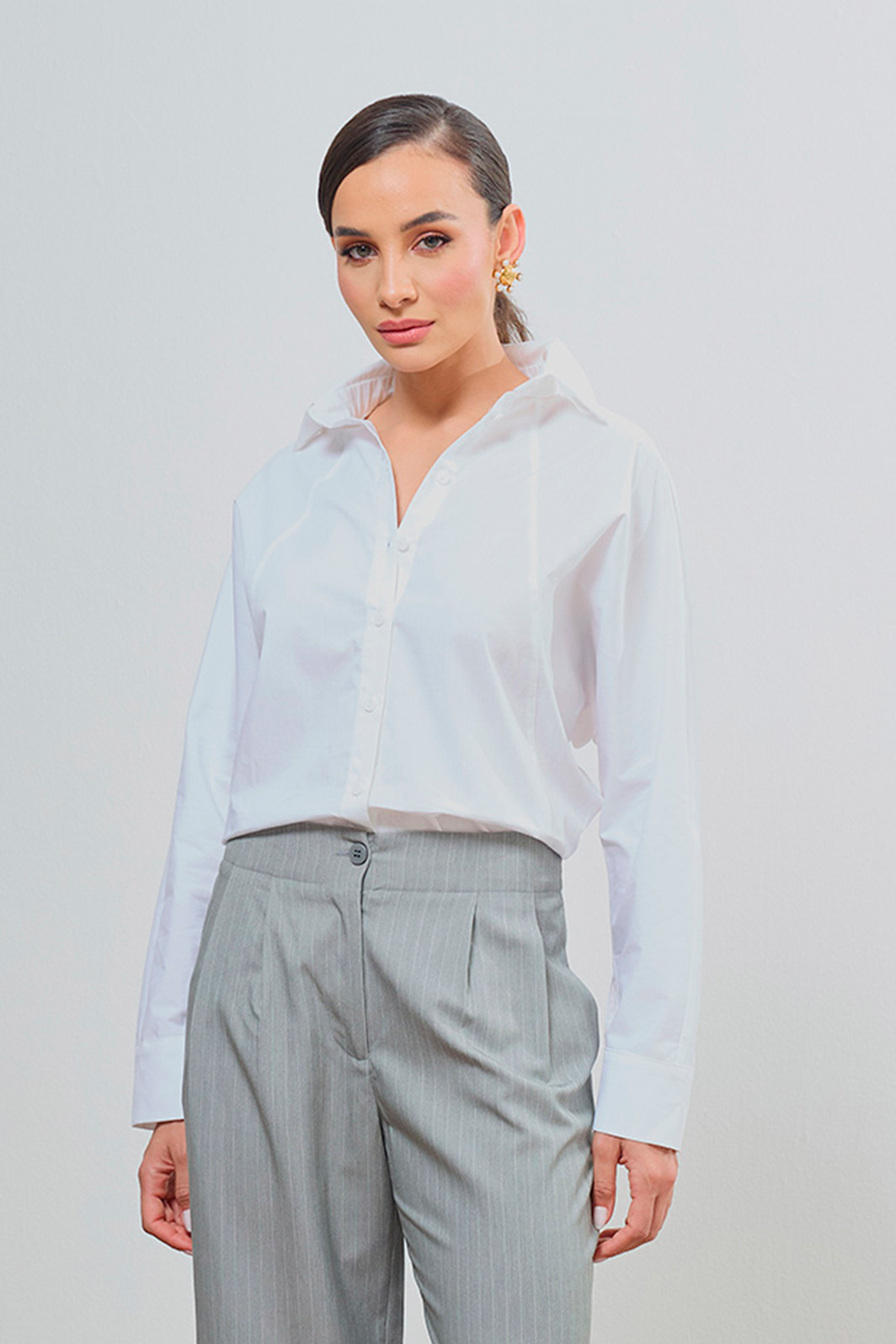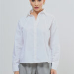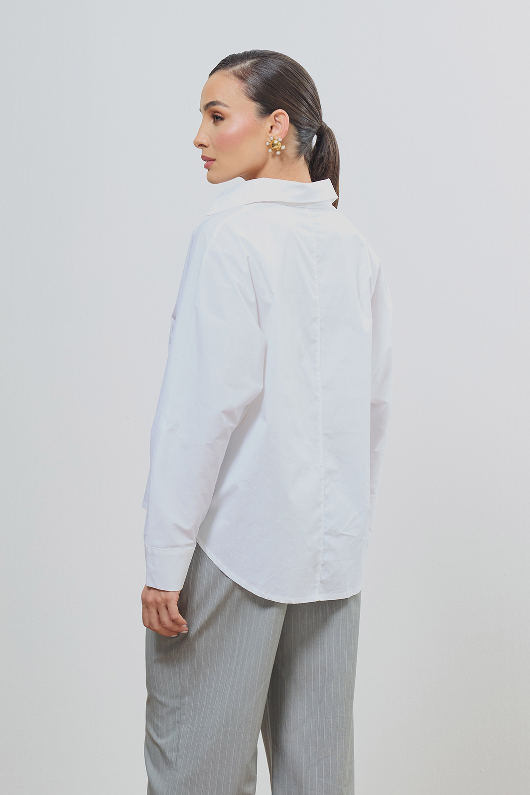 A clássica camisa branca ganha um toque contemporâneo através de recortes estratégicos que valorizam a estrutura da peça. Em tricoline, ela oferece o equilíbrio ideal entre frescor e elegância para o closet feminino.