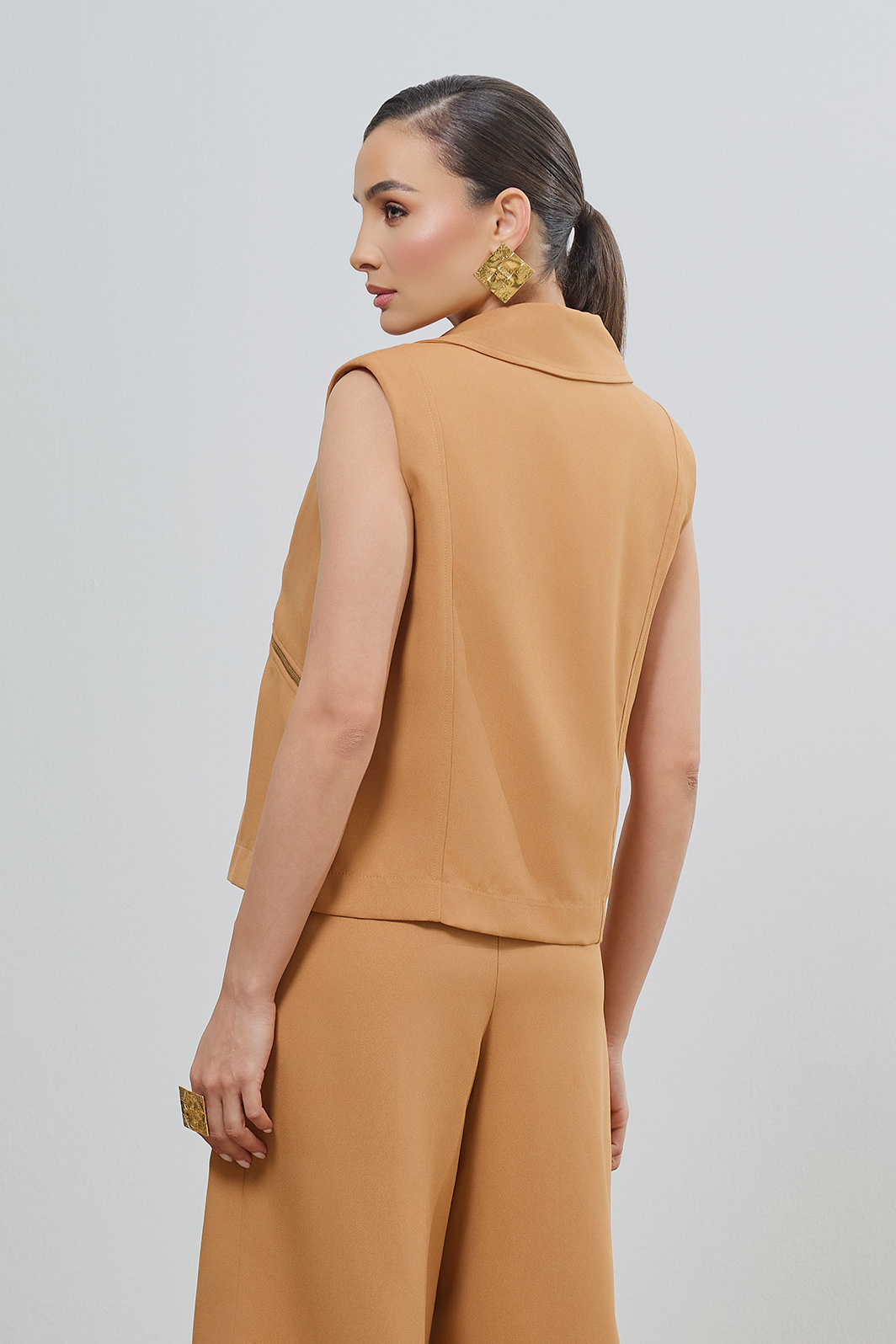 Colete feminino modelo biker confeccionado em crepe de alfaiataria na cor caramelo, apresentando shape estruturado e contemporâneo. O design destaca-se pelo fechamento assimétrico e detalhes em zíper metálico, unindo a atitude urbana à sofisticação da alfaiataria.