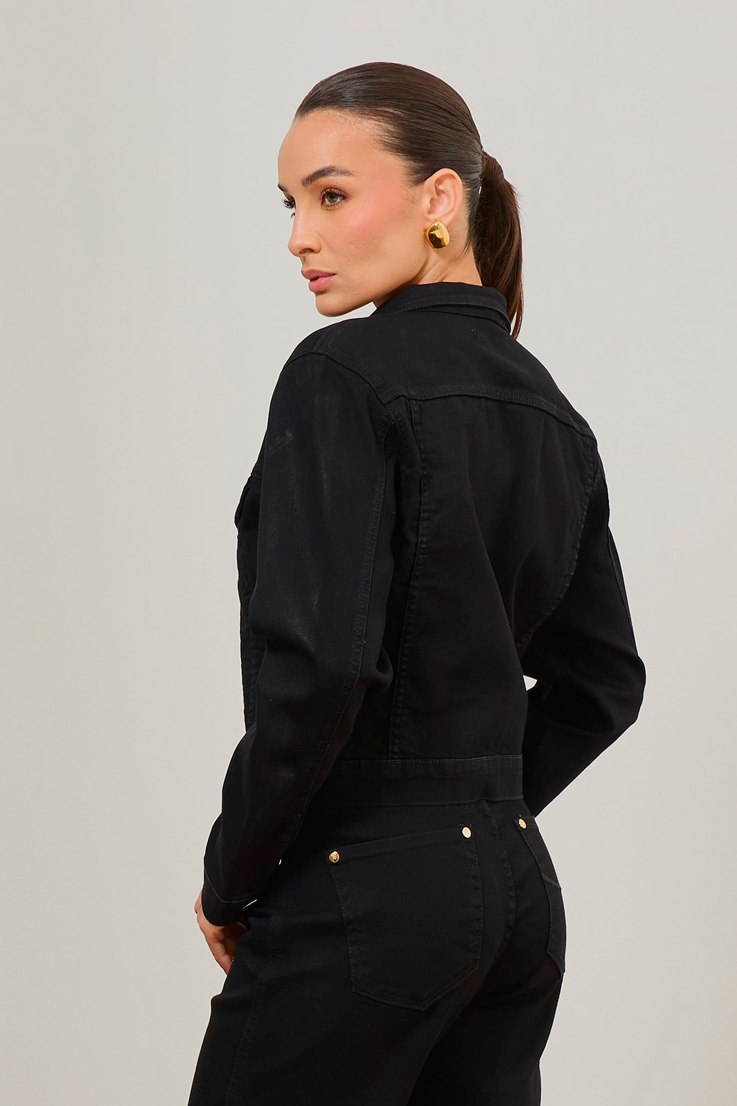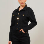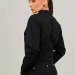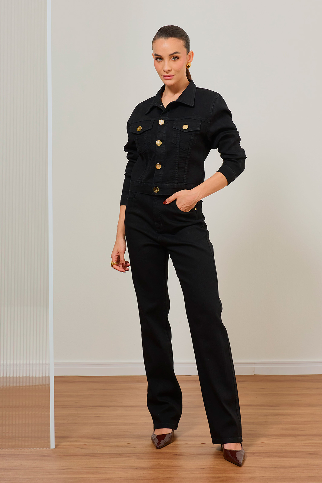 Combine com a calça de sarja coordenada para um conjunto full black imponente. Finalize com acessórios dourados para realçar o brilho dos detalhes da peça.