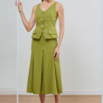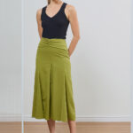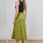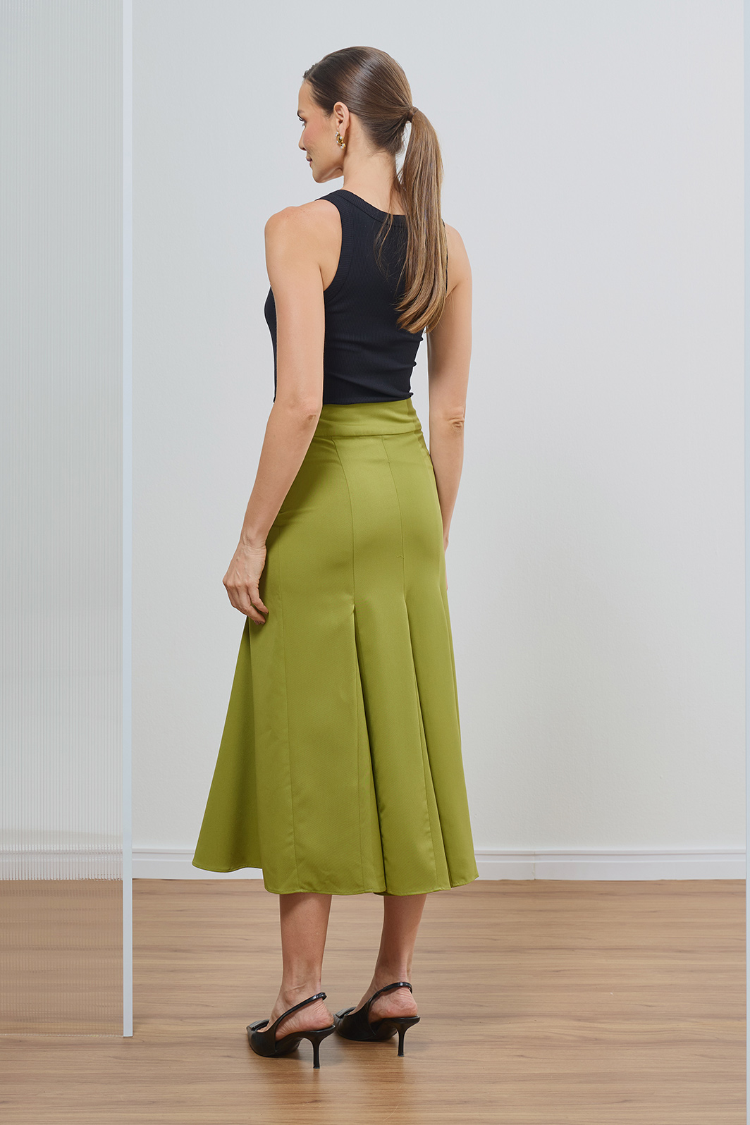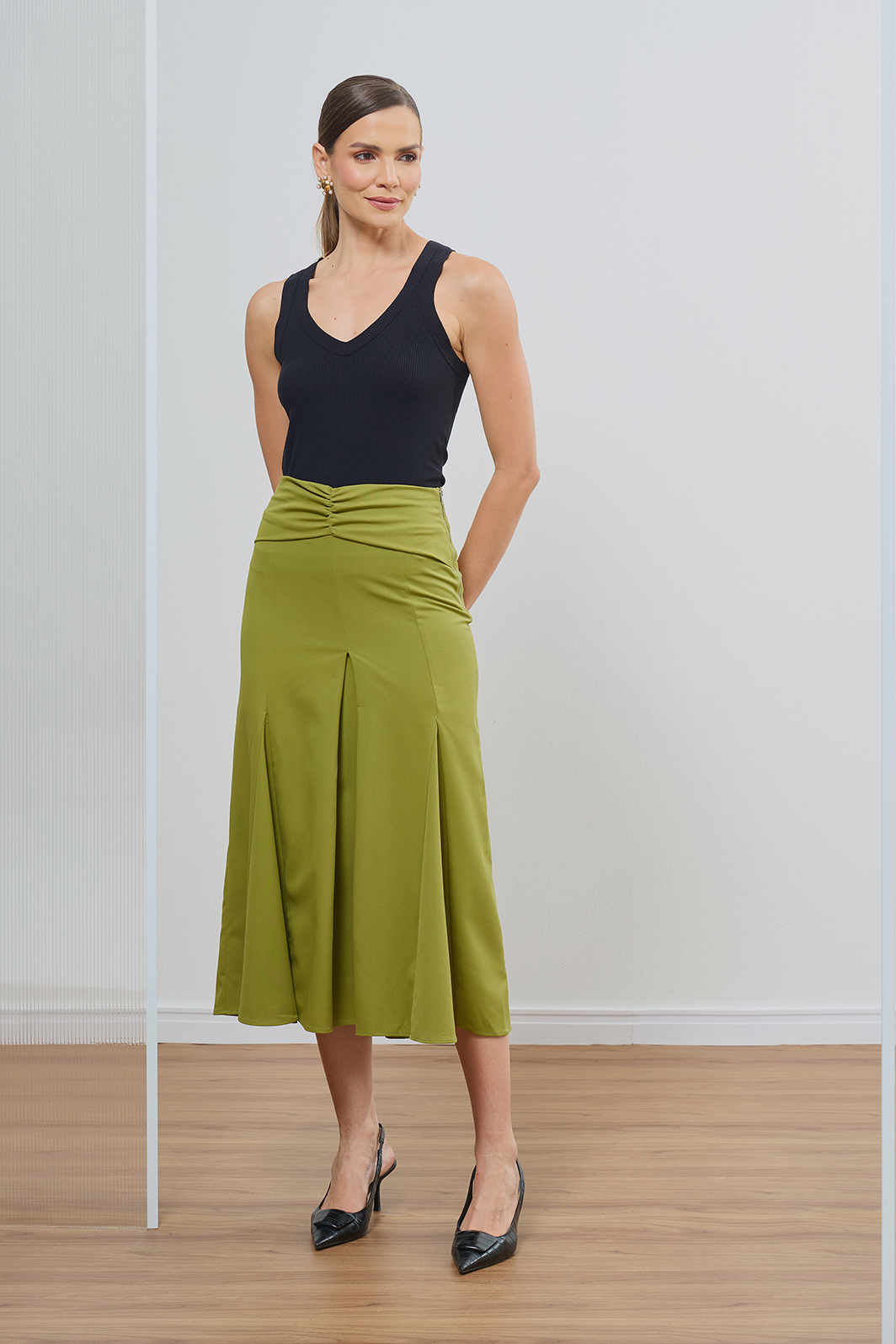 Saia feminina midi confeccionada em tecido de alfaiataria na cor verde oliva. A peça apresenta o shape evasê com pregas frontais e traseiras que conferem um movimento fluido e elegante à silhueta. O destaque fica para o cós com detalhe franzido, que valoriza a cintura com modernidade e sofisticação.