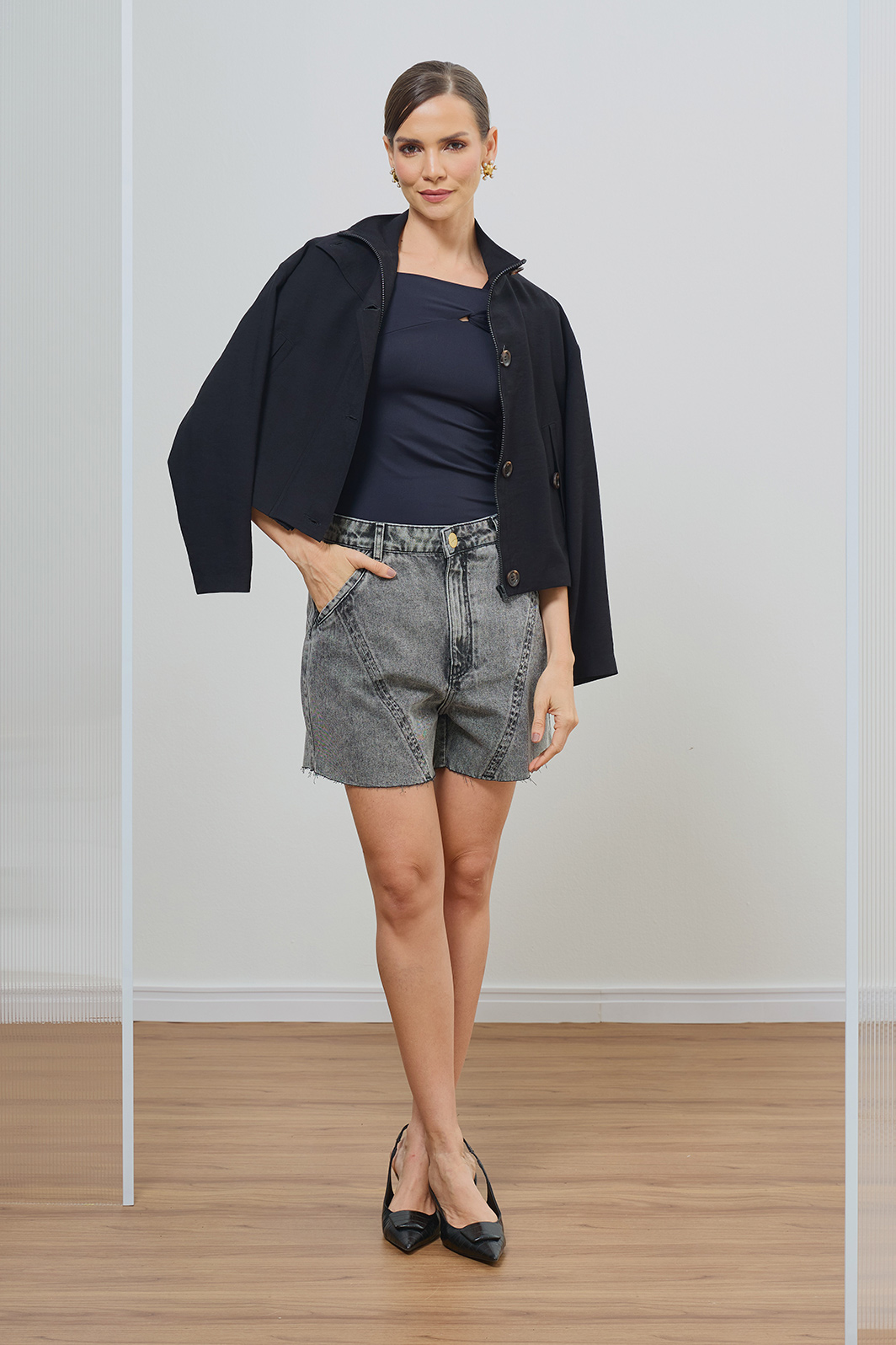 Combine com regatas ajustadas, bodies ou camisas oversized para um visual moderno. Nos pés, botas de cano curto ou sandálias de tiras completam a produção com sofisticação urbana.