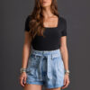 - Peças em jeans podem lacear após uso. Esse é um processo natural do tecido trazendo mais conforto e adaptação ao corpo