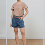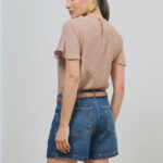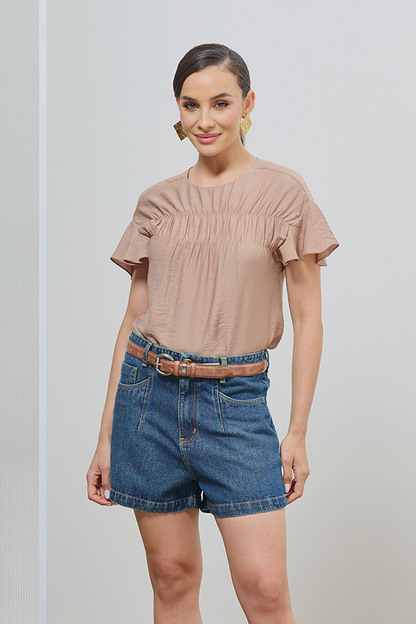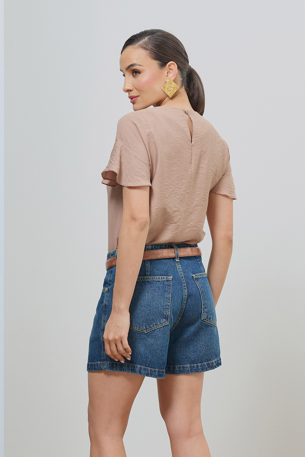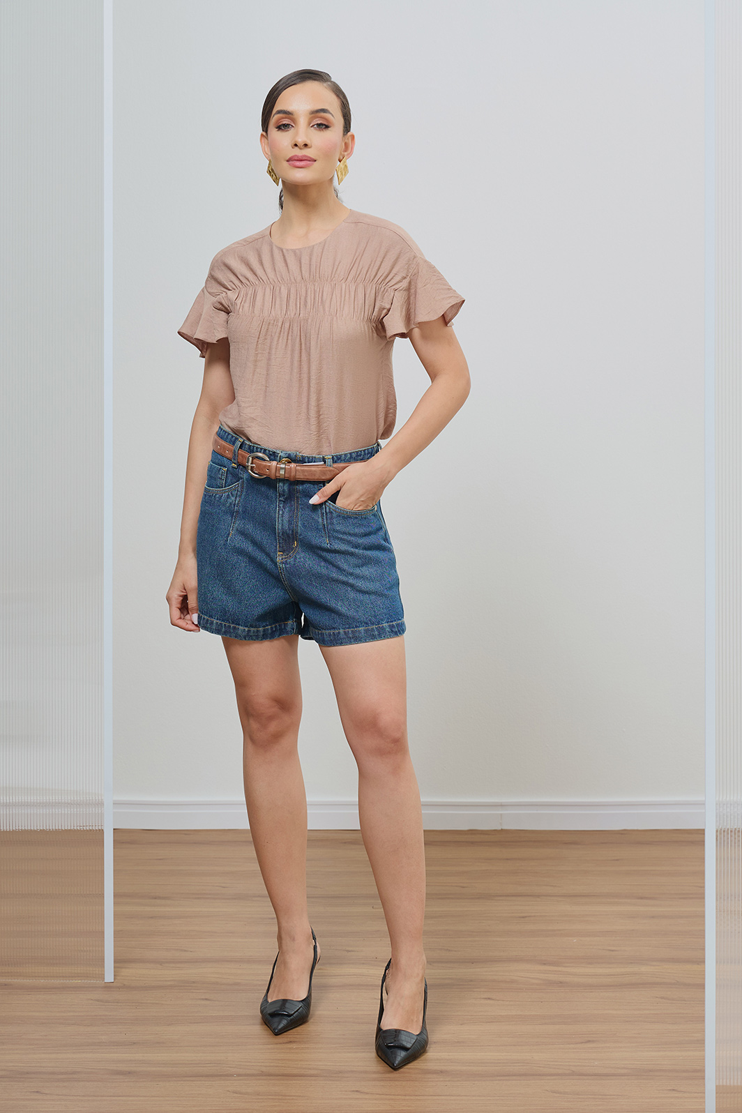 Short jeans feminino confeccionado em denim de lavagem média, com cintura alta e pences frontais que valorizam a silhueta com sofisticação. Apresenta o design clássico five pockets e um corte estruturado, unindo a versatilidade indispensável do jeans a detalhes que elevam o visual casual para produções modernas e atemporais.