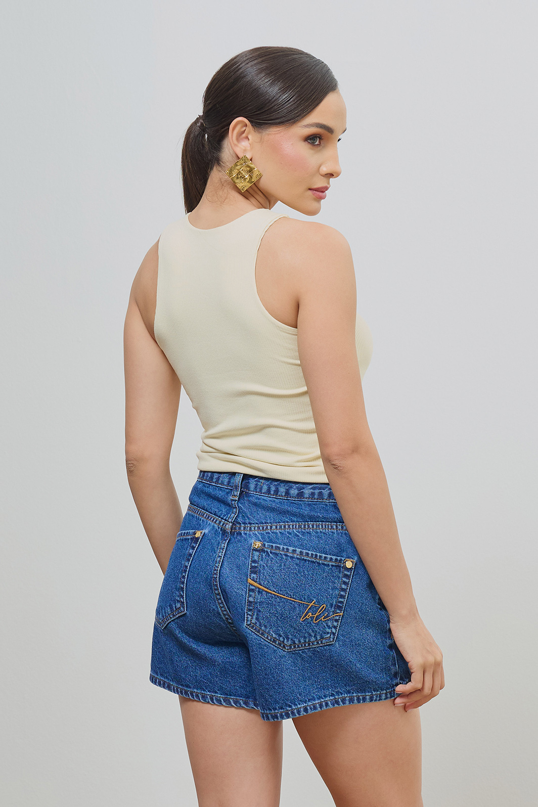 Short jeans feminino confeccionado em denim de lavagem média, apresentando o clássico shape five pockets com cintura alta que valoriza a silhueta. A peça possui acabamento em bainha tradicional e o exclusivo bordado TOLI no bolso posterior, unindo a praticidade do jeans a um detalhe sofisticado e identitário.