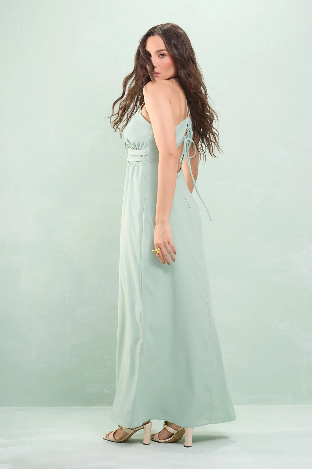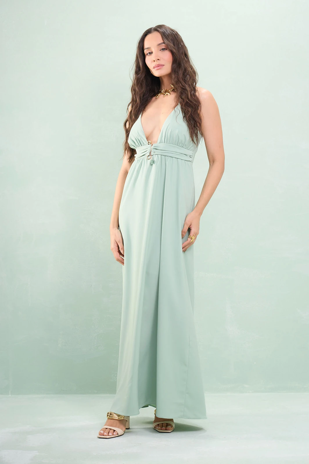 Vestido Longo Alça Fina Com Detalhe Pedra Crepe