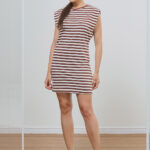 Vestido feminino curto confeccionado em moletinho listrado nas cores marrom e off-white, apresentando shape reto com ombros levemente estruturados. A peça une o conforto indispensável do algodão a um design moderno e atemporal, sendo a escolha ideal para produções práticas com informação de moda.